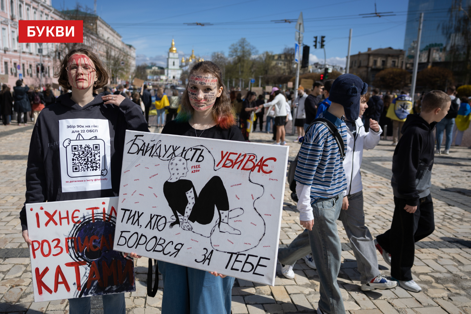 Учасники принесли на мітинг плакати з написами: “Прямо зараз їх катують”, “Полон — це смерть, розтягнута у часі”, “18 місяців не чую голос тата”, “Ви — голоси тих, хто досі в полоні”, “Мовчання вбиває не гірше кулі”, “Боріться за них так, як вони боролися за вас”.