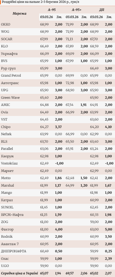 Роздрібні ціни на пальне в Україні знову зросли: з 2 по 3 березня бензин і дизель додали у середньому понад 2 грн/л. Чергове здорожчання пов’язують із рекордним зростанням гуртових цін на нафту та нафтопродукти.