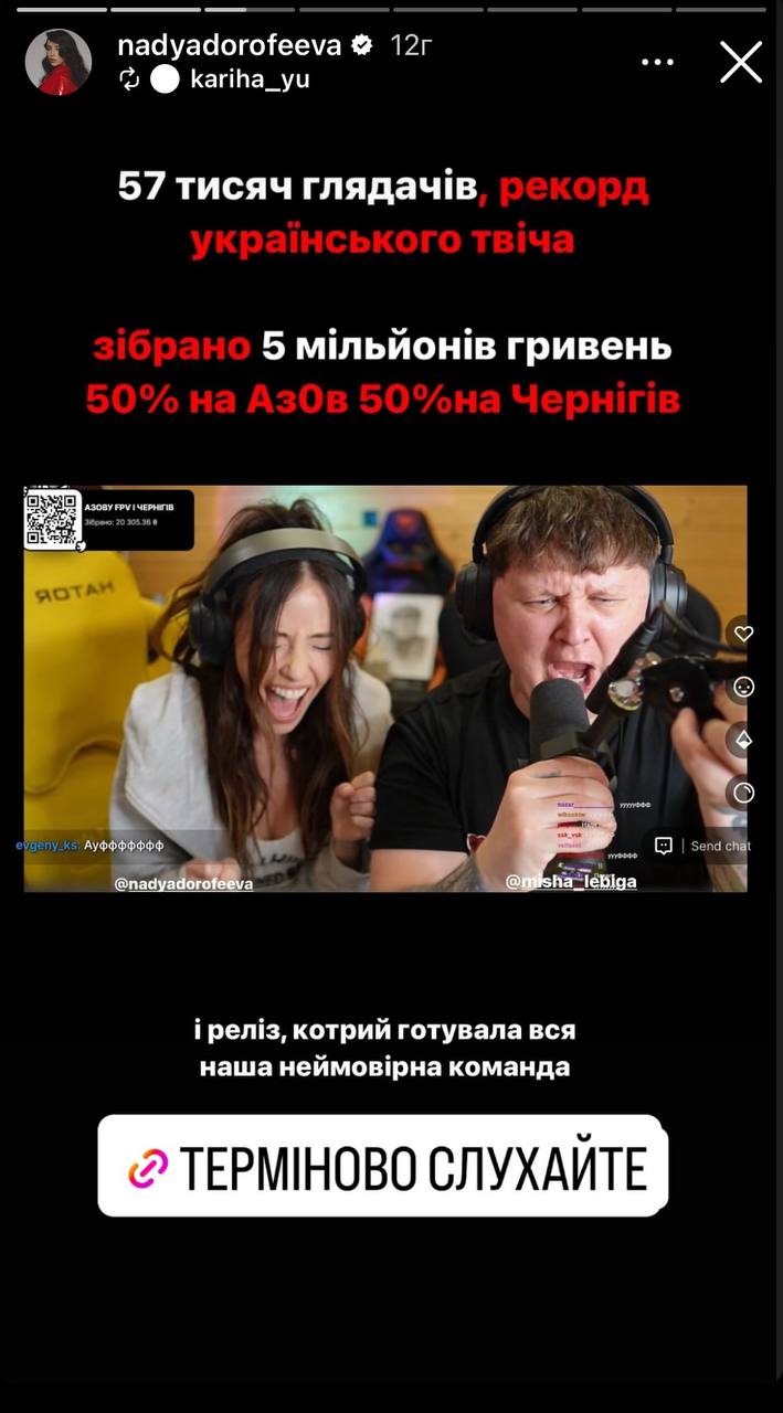 Українська співачка Надя Дорофєєва та стример Михайло Лебіга зібрали під час спільної трансляції 5 мільйонів гривень для допомоги військовослужбовцям “Азова” та Чернігову, який нещодавно постраждав від російського ракетного удару. Загальна сума зібраних коштів – понад 6,1 млн грн.