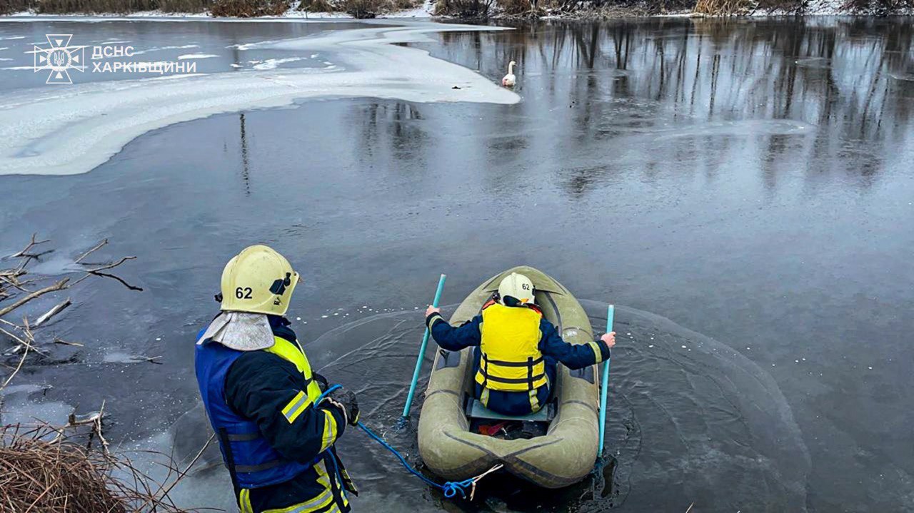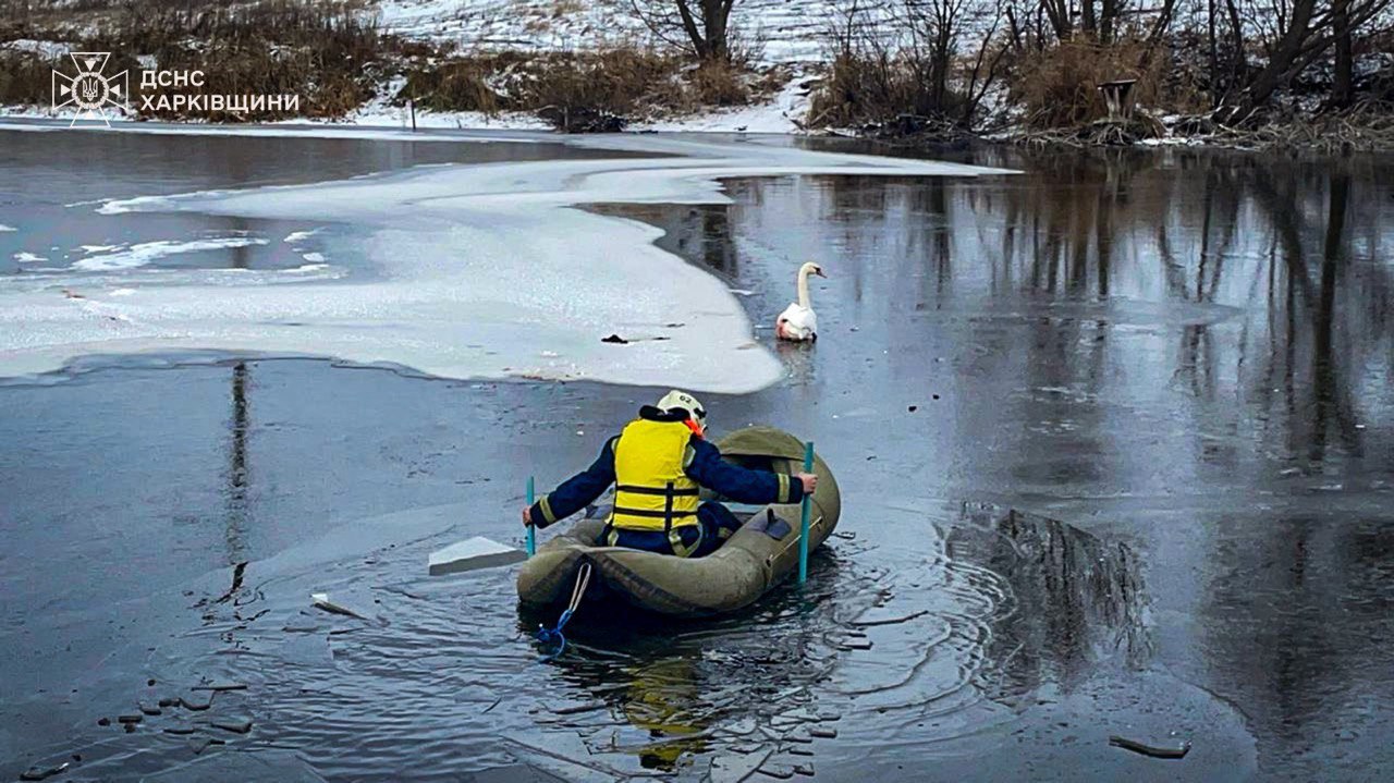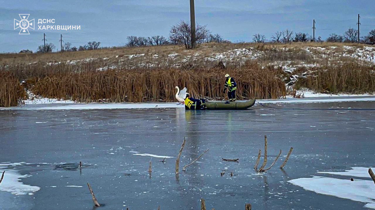 На Харківщині врятували пораненого лебедя. Надзвичайники зауважили, що птах перебував на кризі місцевого ставка у селі Подворки.
