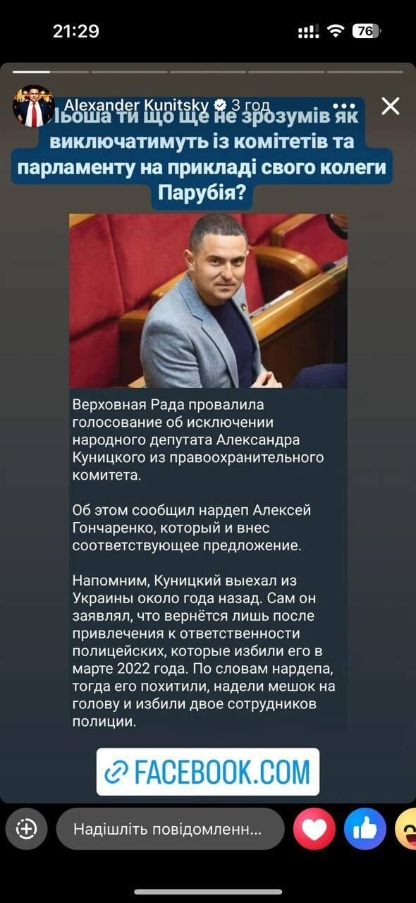 Народний депутат Олександр Куницький, котрий вже тривалий час перебуває за межами України, прокоментував голосування щодо виключення його з Комітету з питань правоохоронної діяльності.