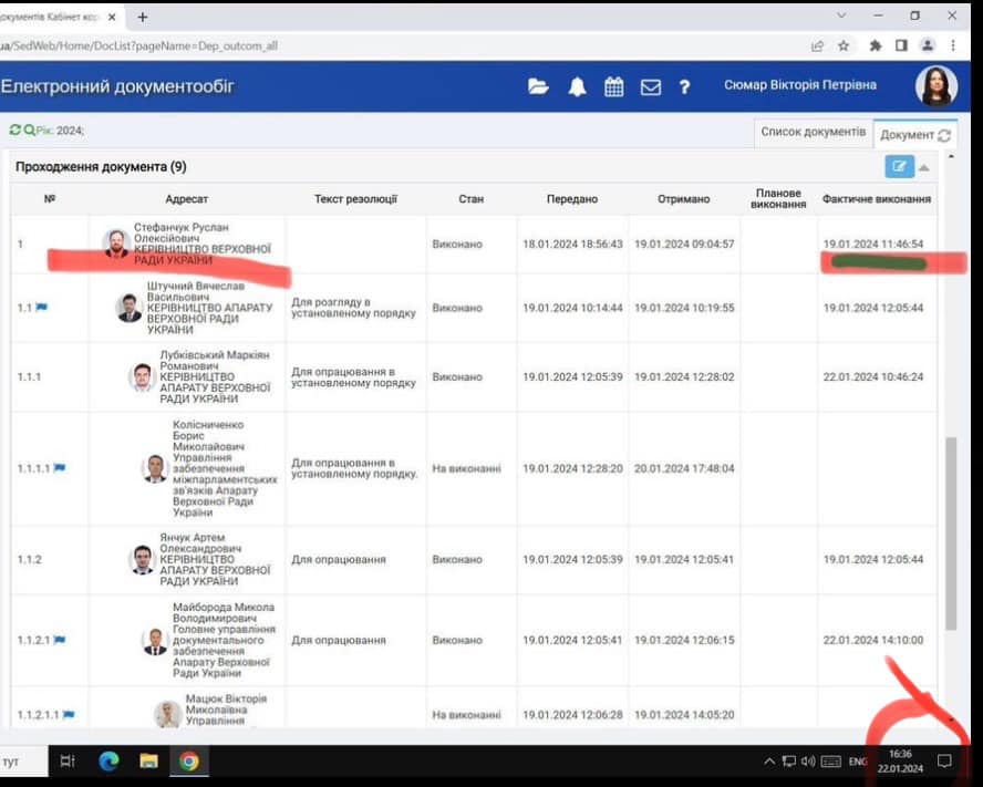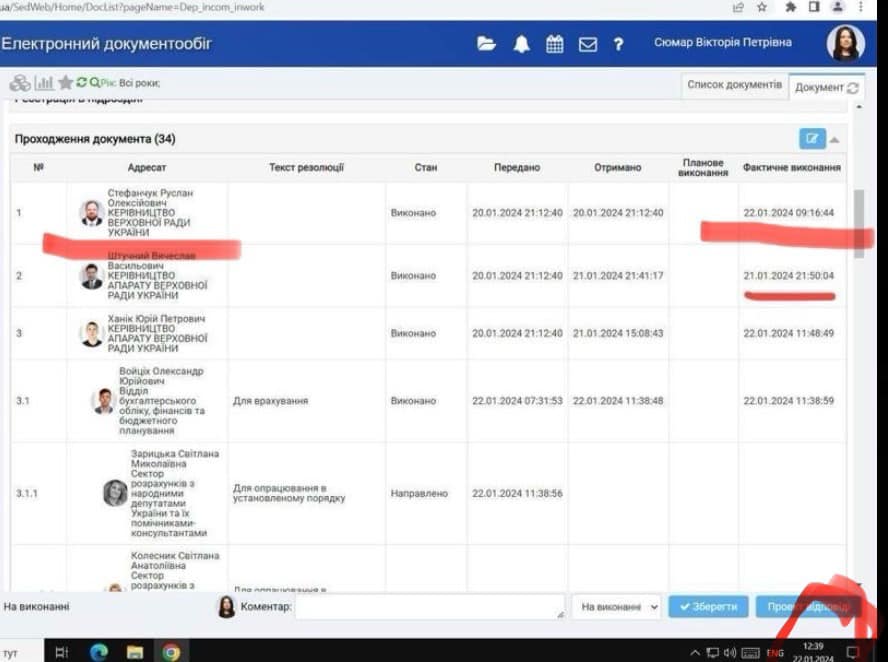 Як би не сумно і соромно було це писати, але історія з відрядженням після публікації посту отримала погане продовження… Власне десь за годину півтори після публікації, розпорядження таки зʼявилося. З системи електронного документообігу СЕДО випливало, що його підписав Стефанчук в 9.16 ранку 22 січня, а сам документ з необхідним для прикордонників QRкодом зʼявився в 11.38 понеділка (захід в Страсбурзі вже почався). Без цього документу перетнути кордон неможливо. Ці цифри ви бачите на скріні першому, зробленому в 12.39 ранку (це внизу фото справа в кружечку зафіксовано), – повідомила нардепка.