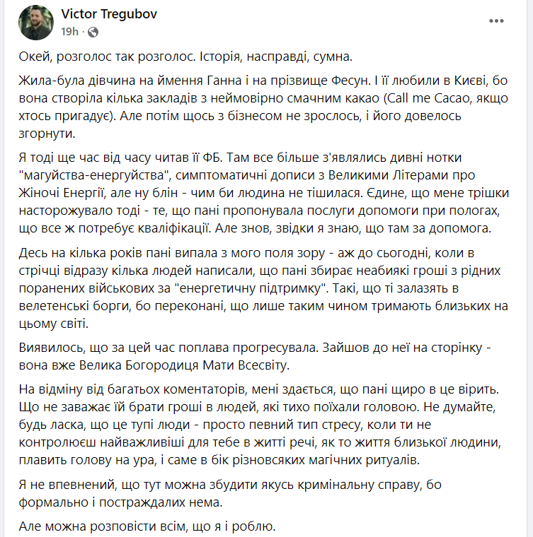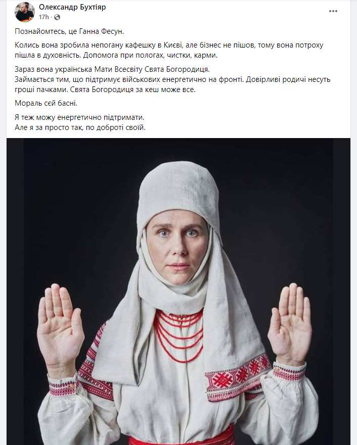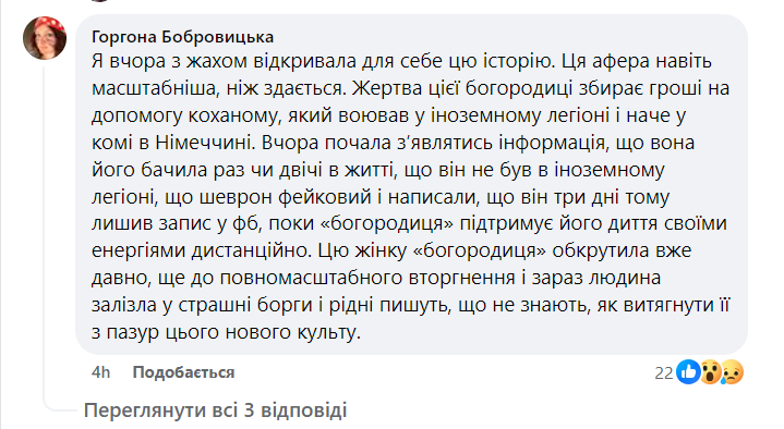 “Наприклад, відомо про жінку, партнер якої, як я зрозуміла, іноземець-військовослужбовець, що зазнав поранення в Україні, перебуває в комі. Він лежить у лікарні в Німеччині, де має хороших лікарів. Проте його партнерка активно збирає гроші по знайомих на те, аби оплатити “послуги” пані Богородиці”, – написала вона.