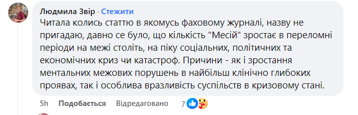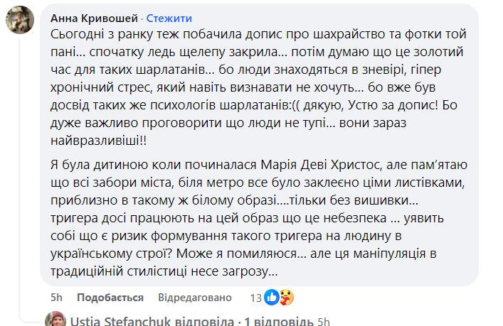 “Наше суспільство зараз в стані перманентного інтенсивного стресу, з постійною загрозою життю і здоровʼю – своєму і близьких, з непевністю у майбутньому, під постійним тиском негативних новин, срачів, недовіри до всього і всіх. Усе це разом робить нас зболеними і супервразливими до різного роду шарлатанства, особливо такого, яке обіцяє нам полегшення, просвітлення…”, – написала одна з користувачок.