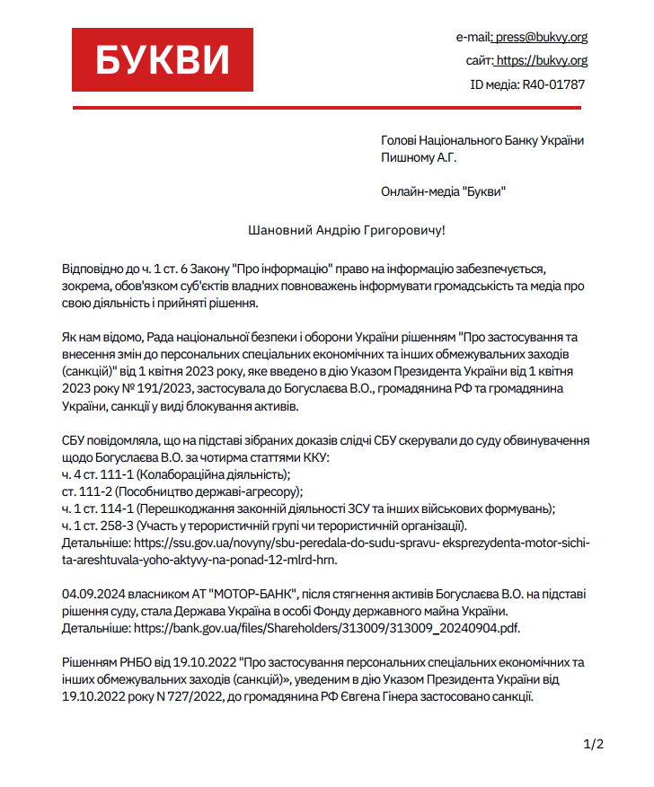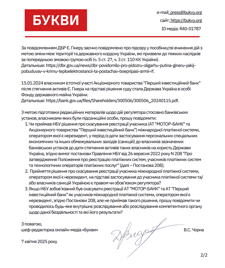 Букви звернулись до НБУ щодо дій регулятора стосовно банківських установ, власниками яких були підсанкційні особи: