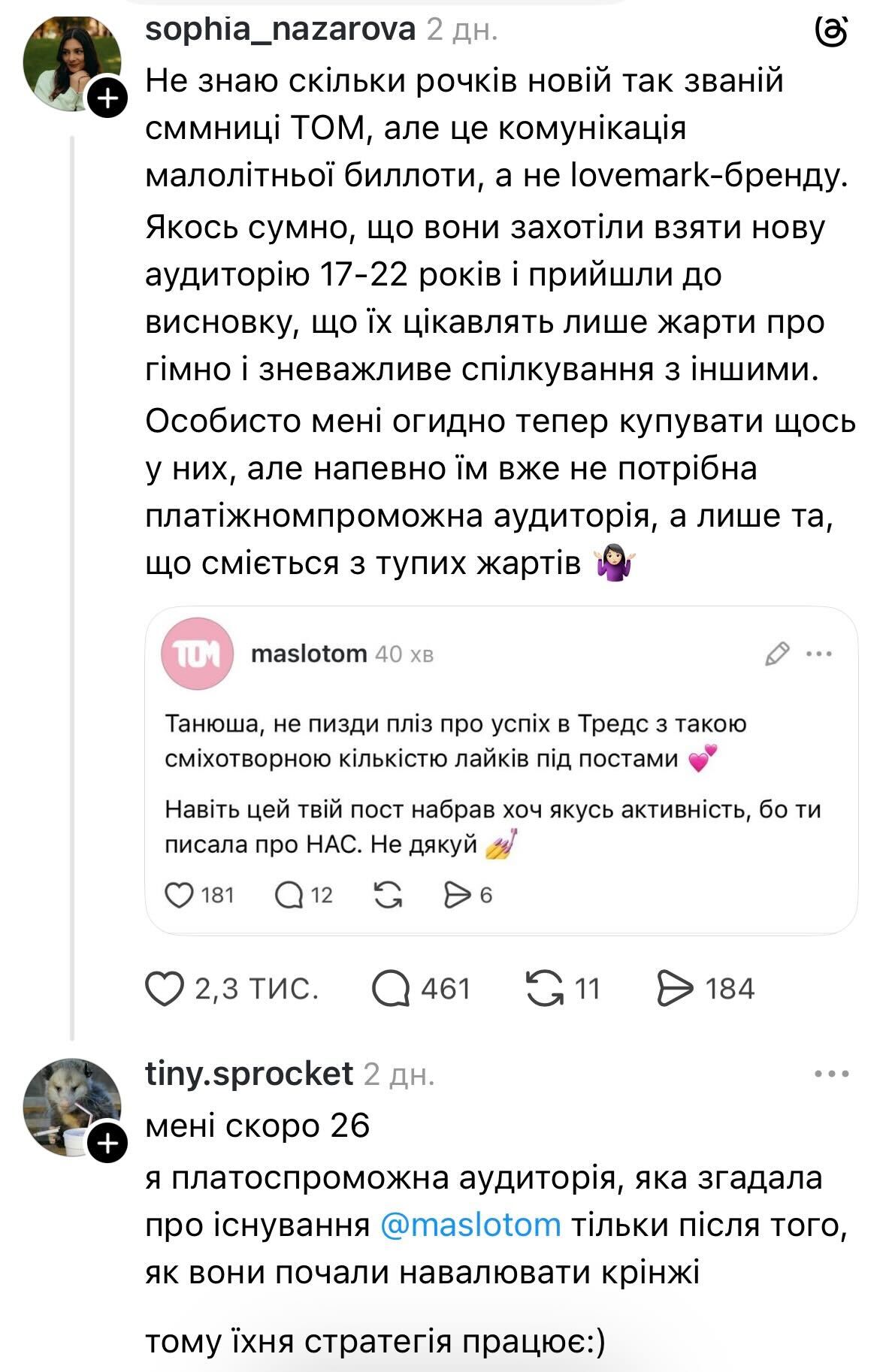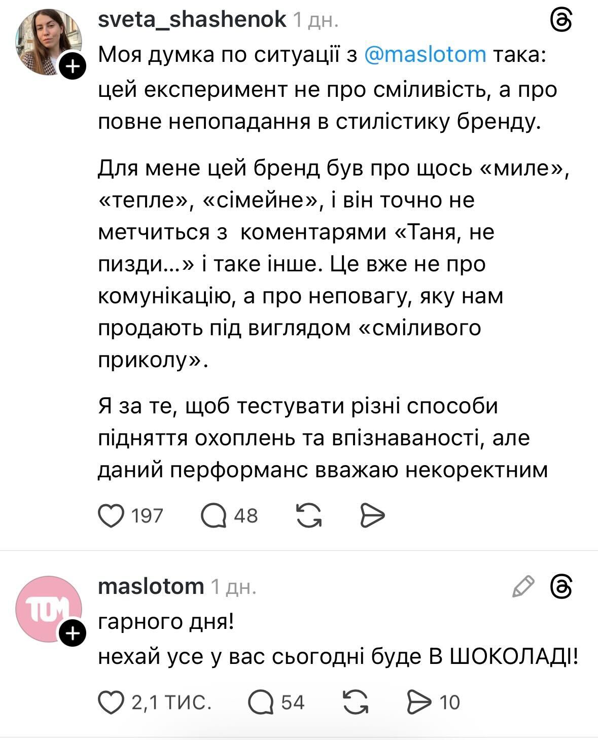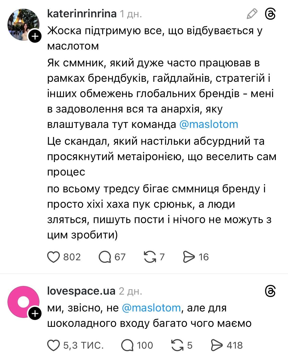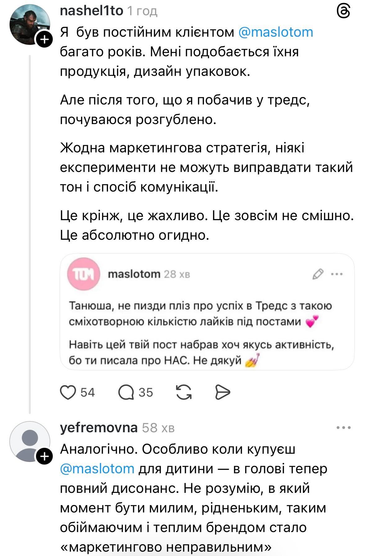 Бренд Maslotom опинився у центрі уваги через свою комунікаційну стратегію у соцмережі Threads, яка розділила аудиторію. Частина користувачів підтримала підхід бренду, інші – розкритикували.