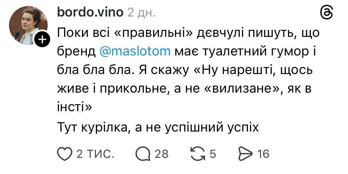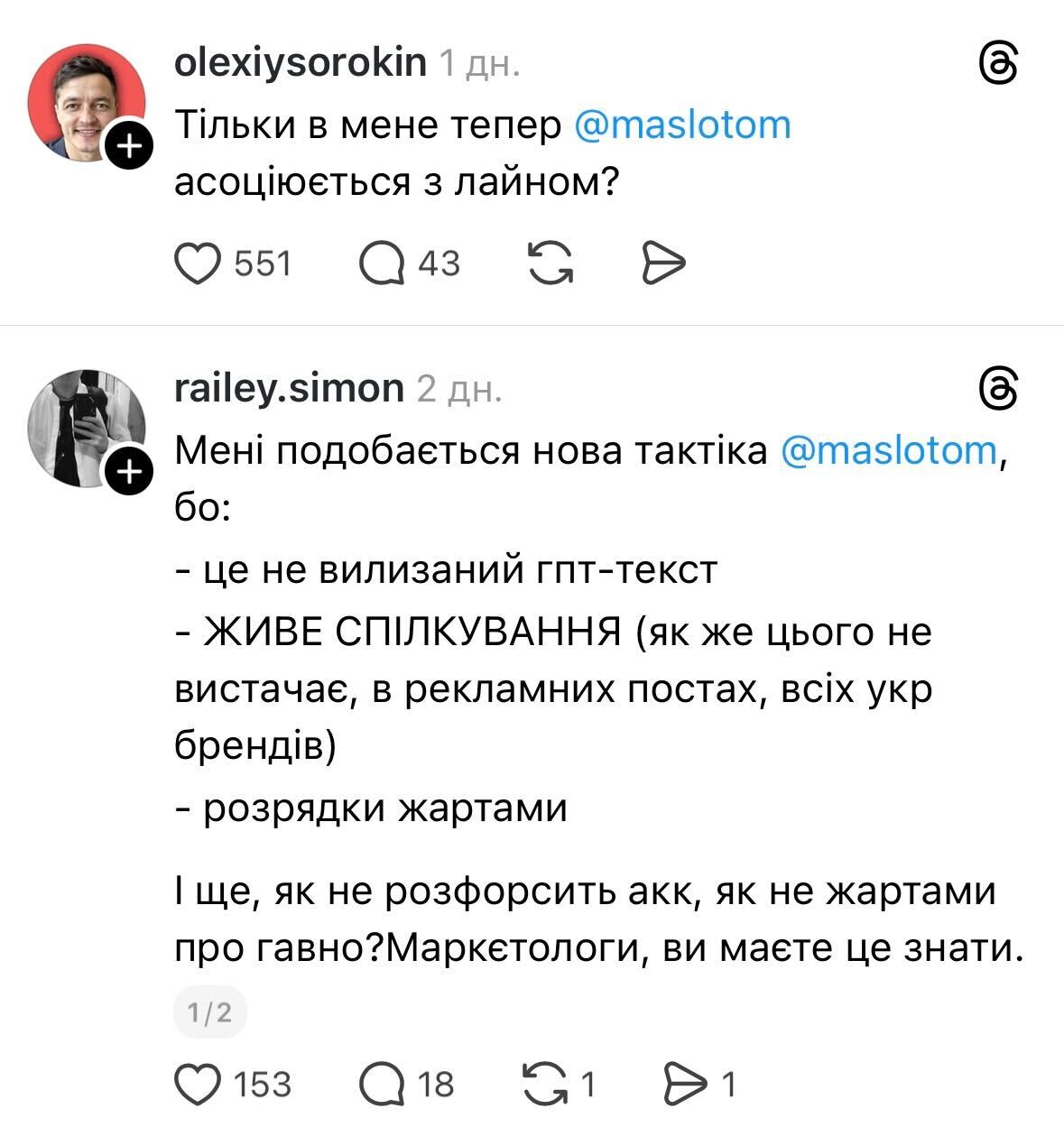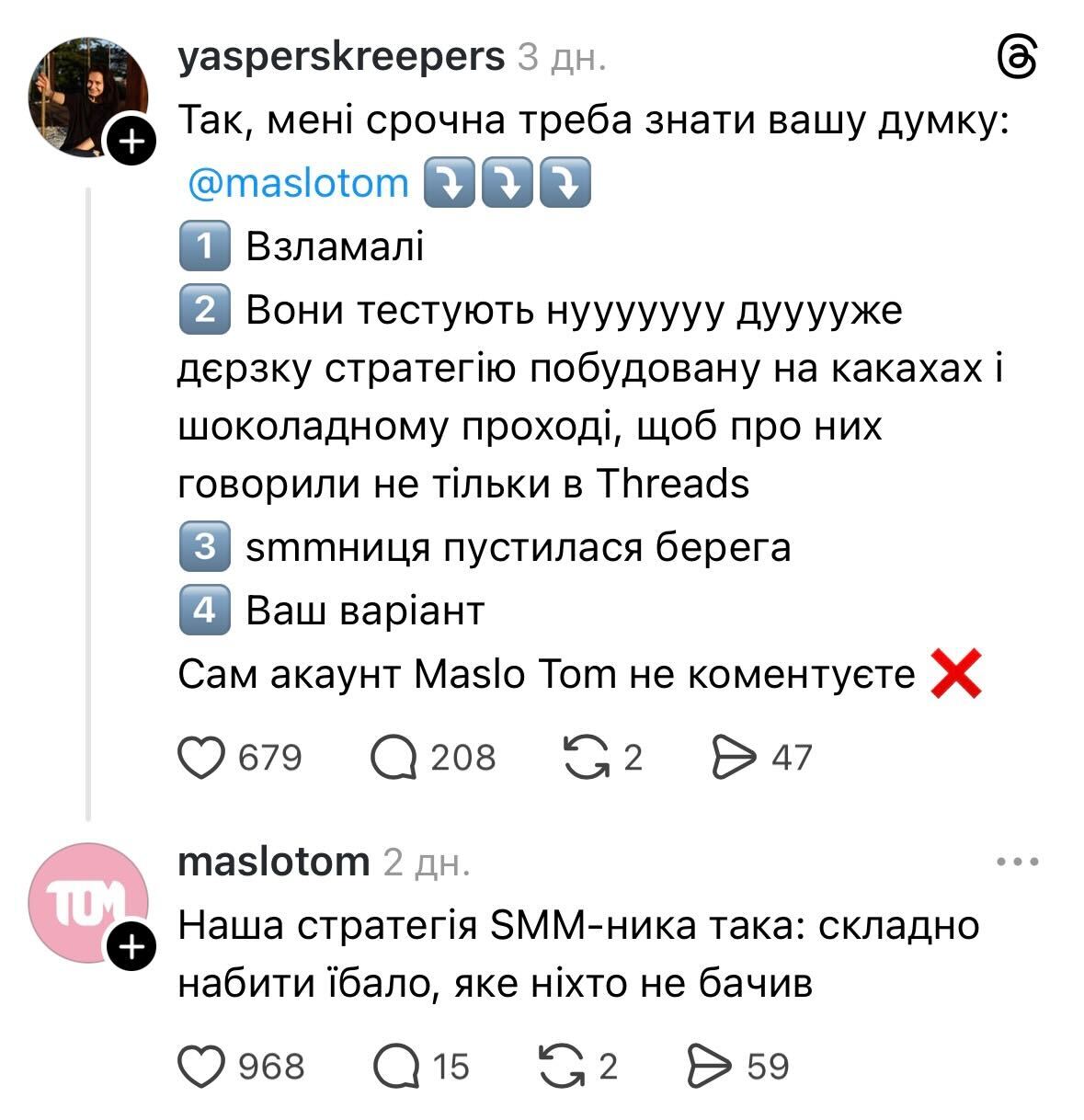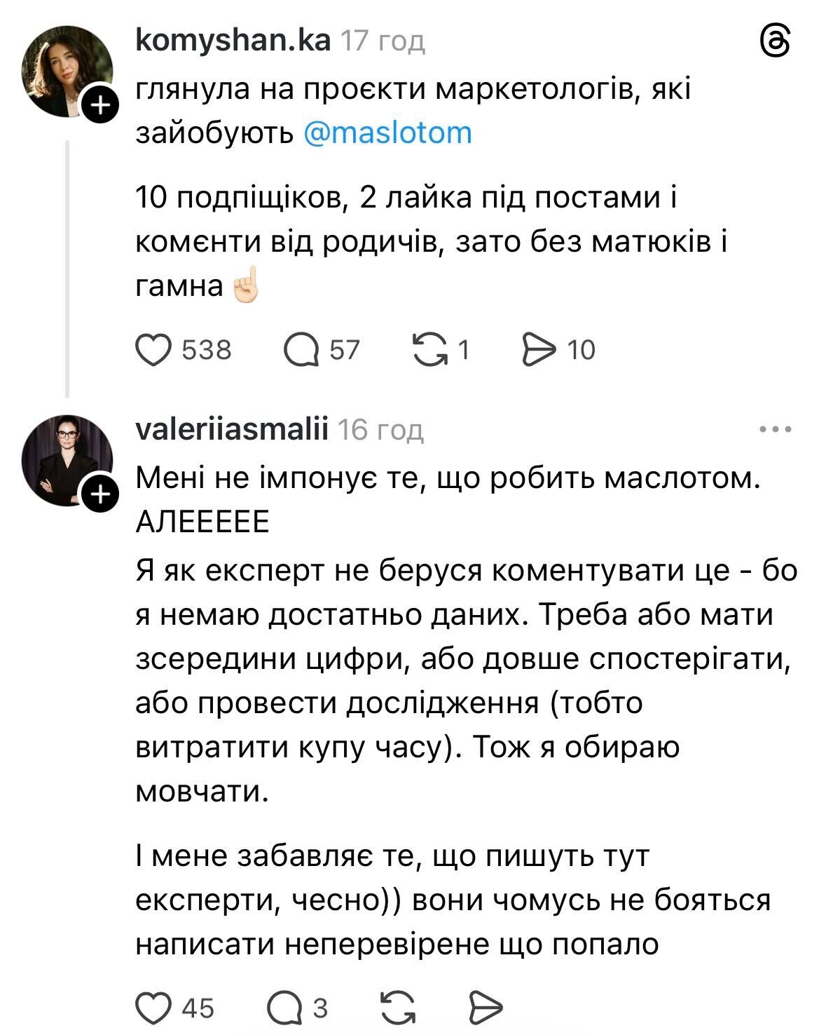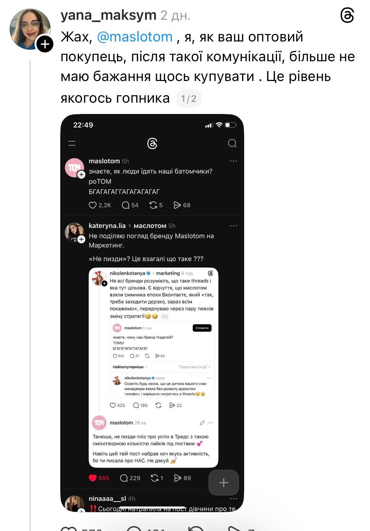 Бренд Maslotom опинився у центрі уваги через свою комунікаційну стратегію у соцмережі Threads, яка розділила аудиторію. Частина користувачів підтримала підхід бренду, інші – розкритикували.