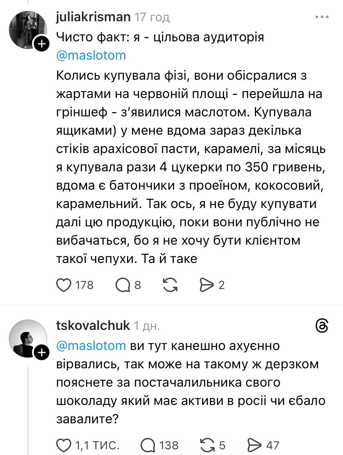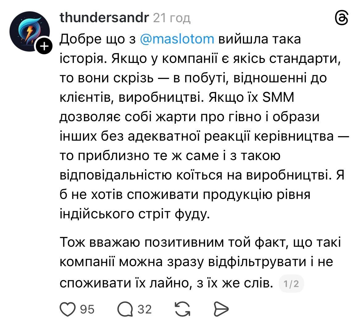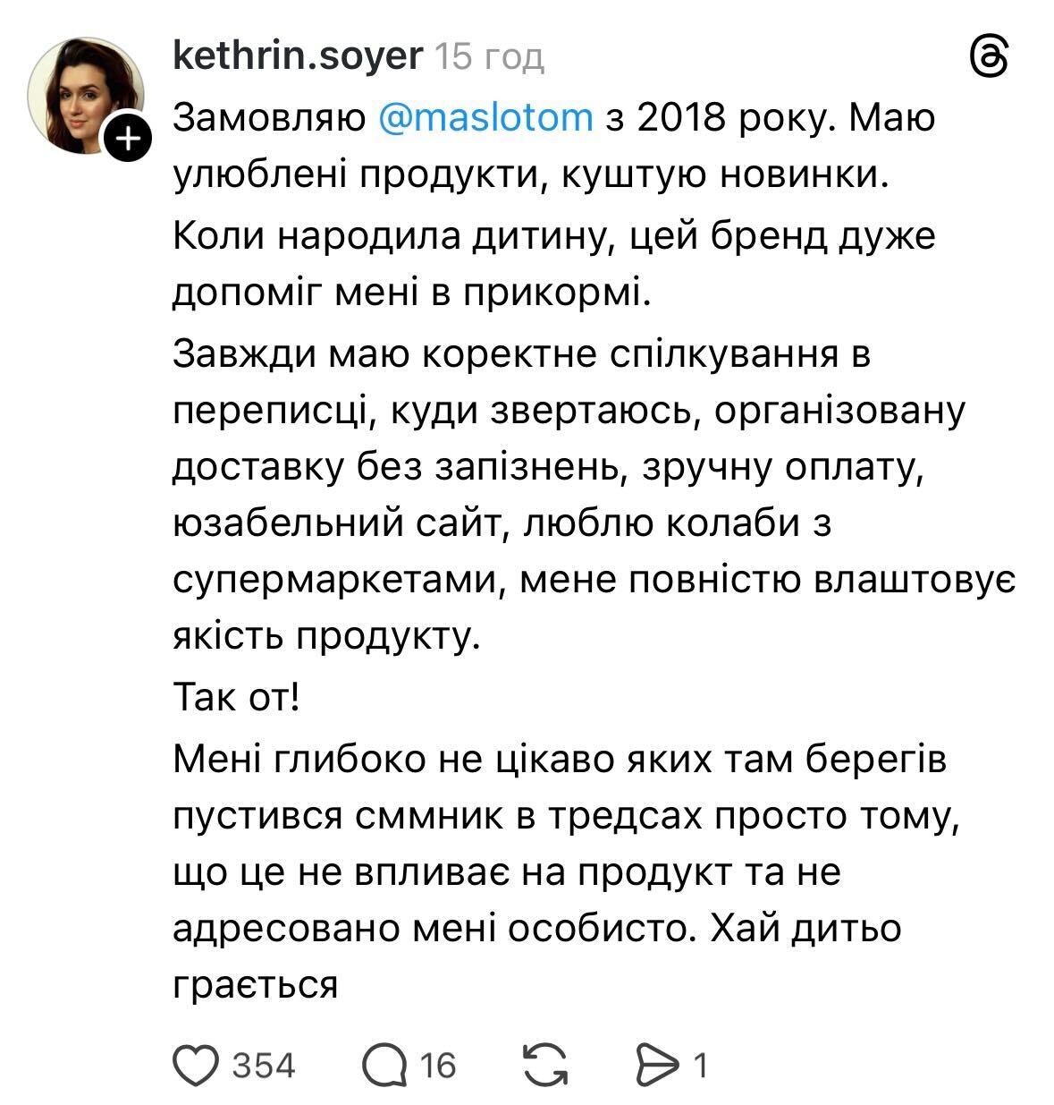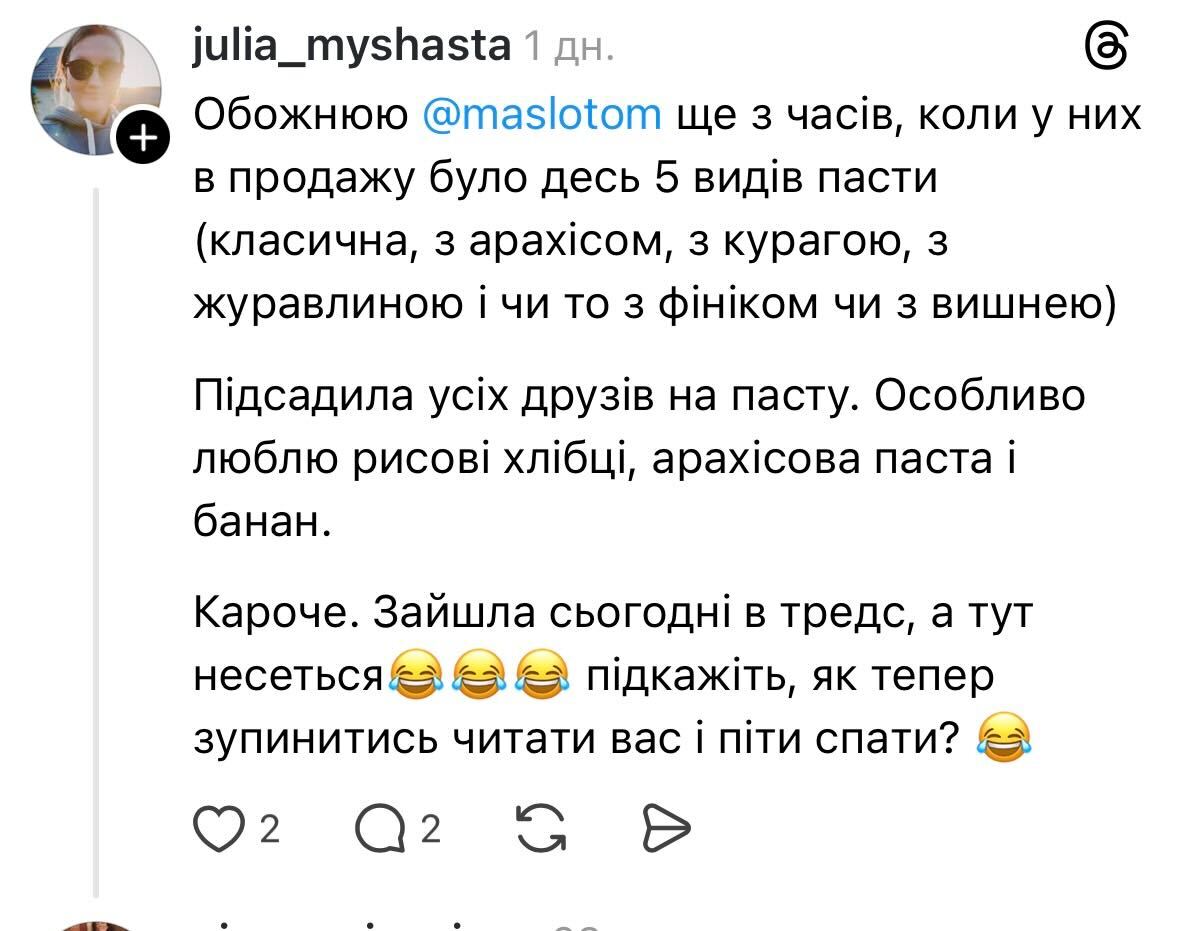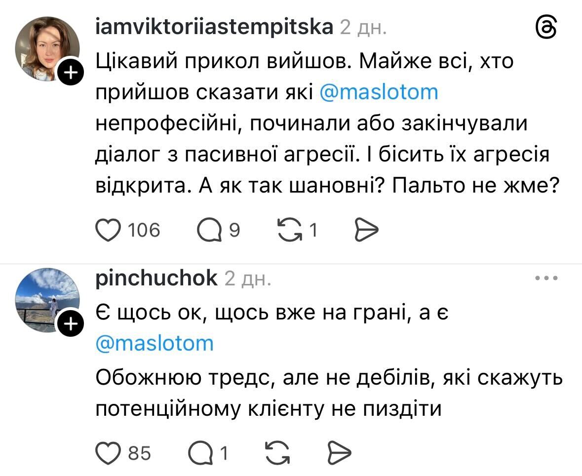 Бренд Maslotom опинився у центрі уваги через свою комунікаційну стратегію у соцмережі Threads, яка розділила аудиторію. Частина користувачів підтримала підхід бренду, інші – розкритикували.