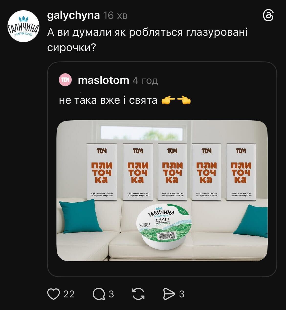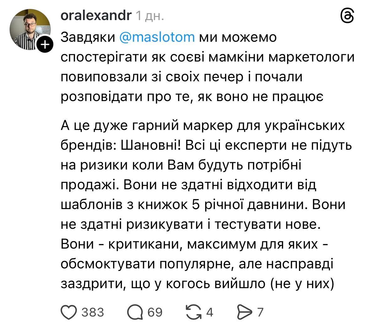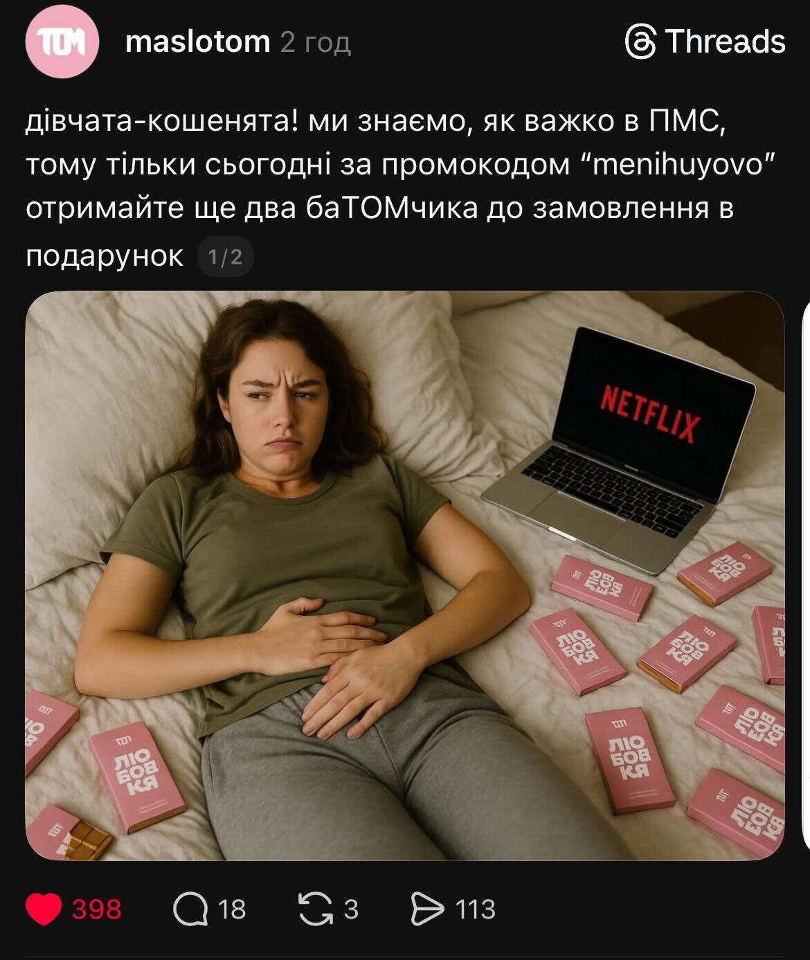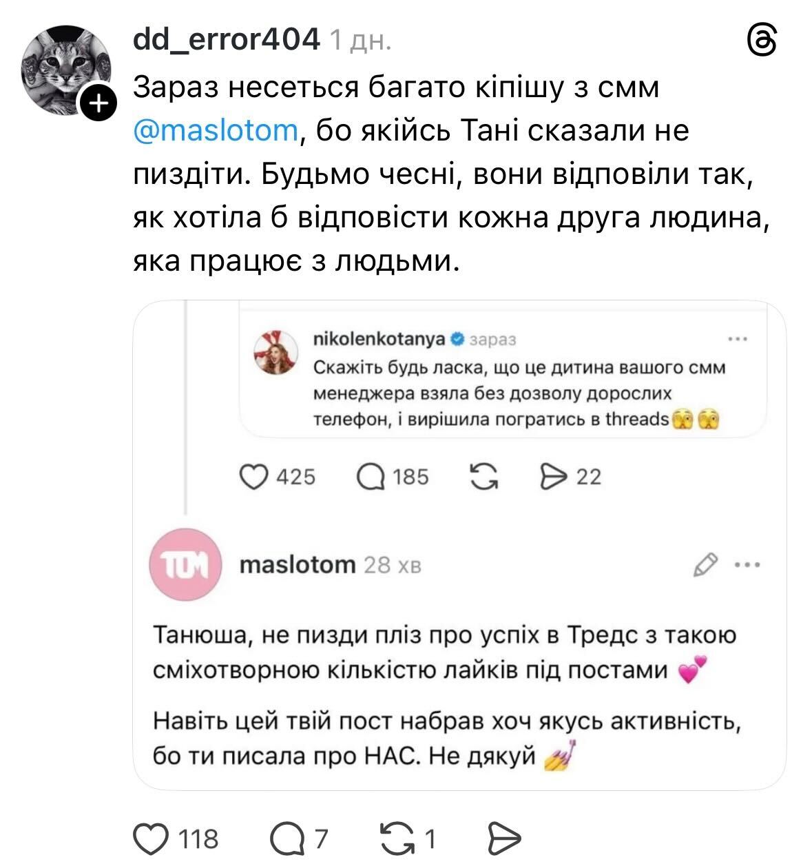 Бренд Maslotom опинився у центрі уваги через свою комунікаційну стратегію у соцмережі Threads, яка розділила аудиторію. Частина користувачів підтримала підхід бренду, інші – розкритикували.