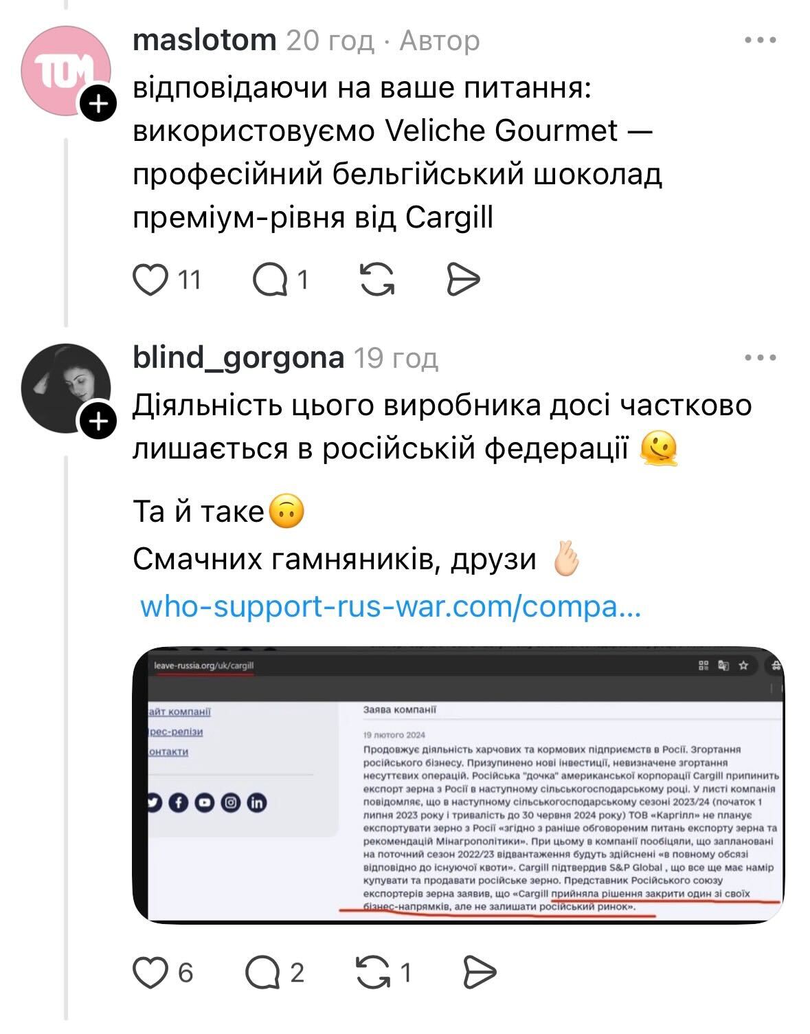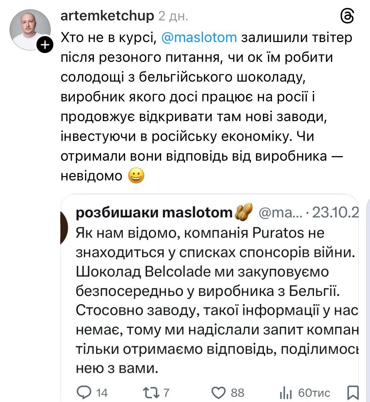 Користувачі у соцмережі також пригадали, що Maslotom свого часу припинив активність у Twitter після того, як користувачі запитали, чому бренд використовує бельгійський шоколад виробника, який продовжує працювати у РФ. Після цього Maslotom фактично покинув платформу. Крім того, у Twitter бренд уже був відомий своїми дописами з нецензурною лексикою.