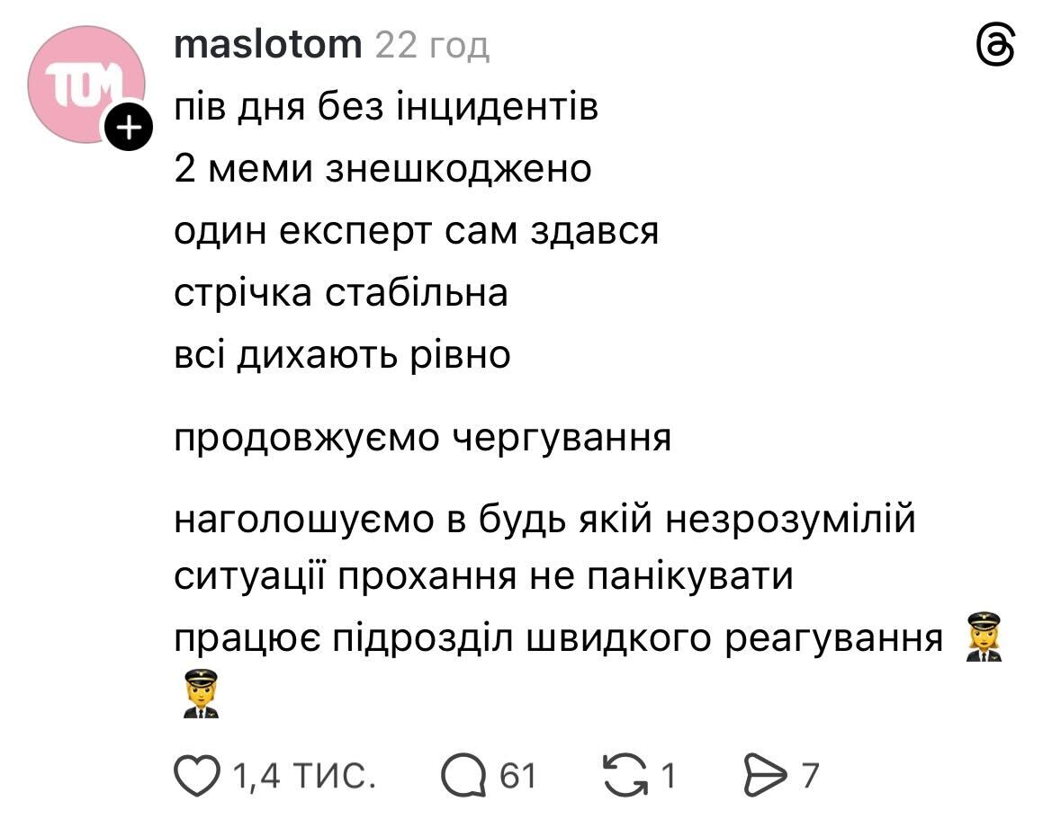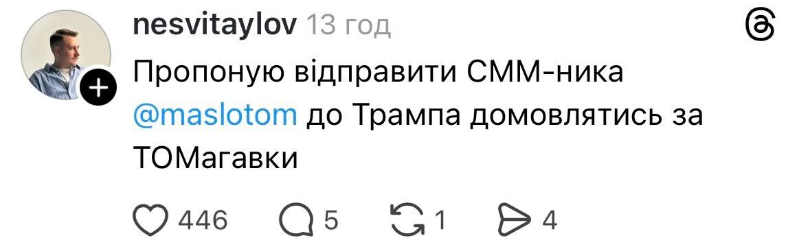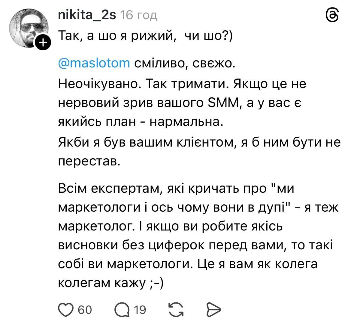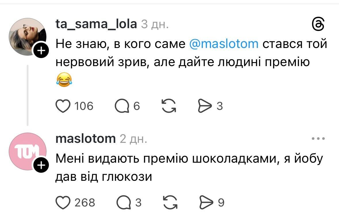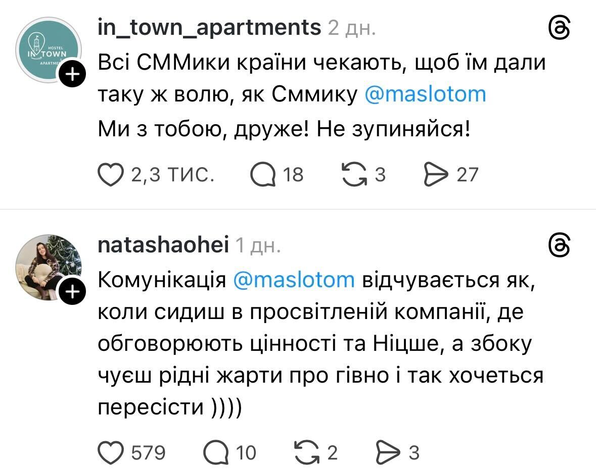 Також Maslotom опублікував низку інших дописів, які викликали різні реакції серед користувачів: деяким їхній креатив і прямота сподобались, інші ж критично оцінили такий підхід.