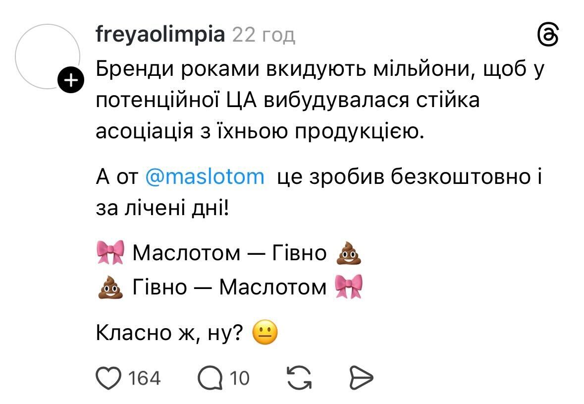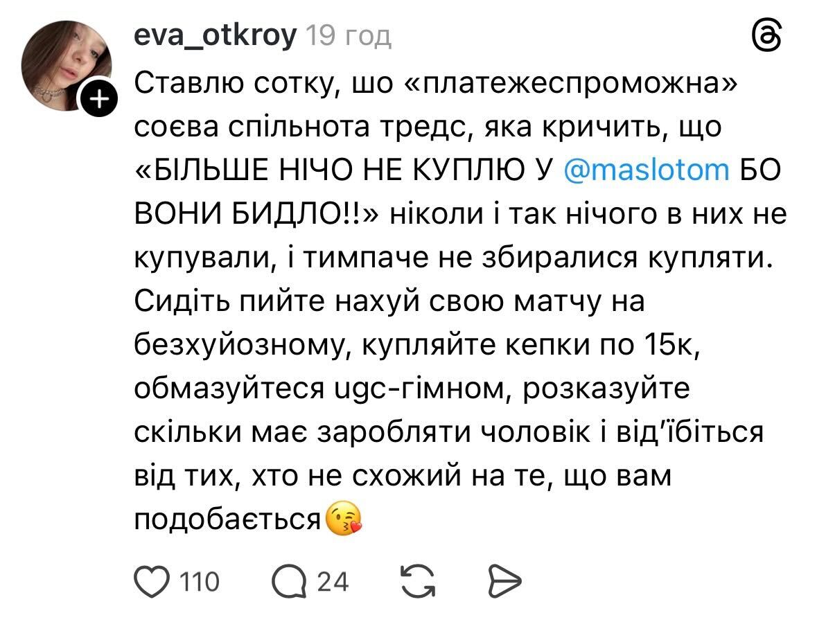 Також у коментарях Maslotom порадив одній із користувачок “не пиз*іти”, що викликало хвилю критики, проте частина користувачів оцінила такий прямий і провокативний підхід бренду.