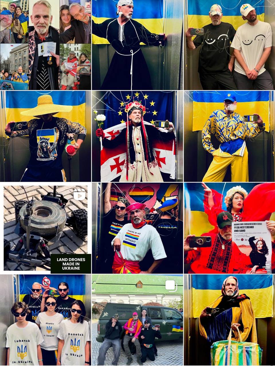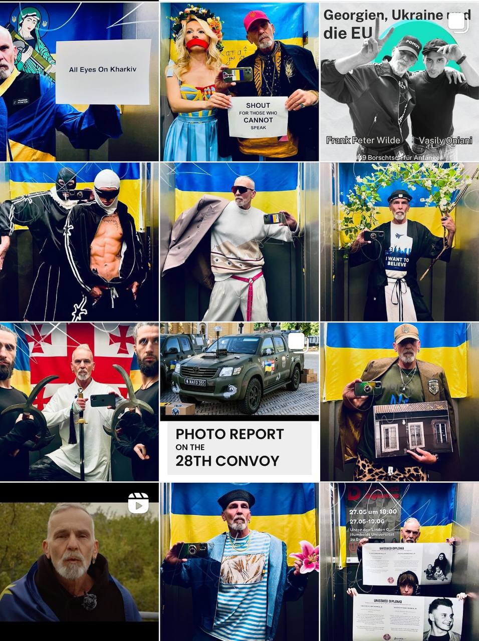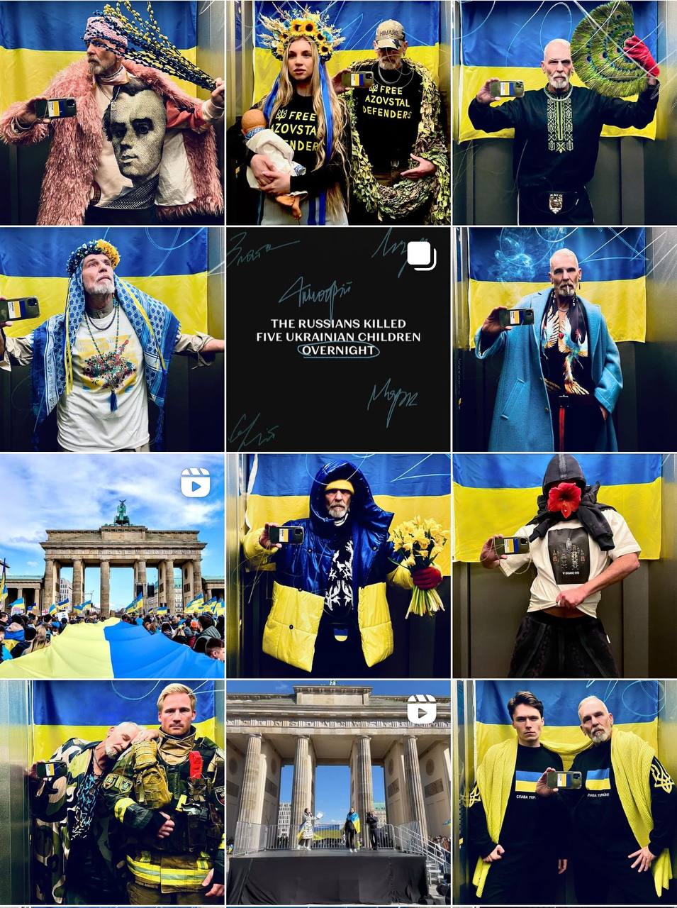 В четвер, 30 травня, він поширив фото, на якому одягнений у вишиванку та кепку з тризубом, а поруч з ним жінка, одягнена у синьо-жовте закривавлене плаття та з закритим ротом. Вони разом тримають аркуш з надписом “Кричіть для тих, хто не може говорити”.