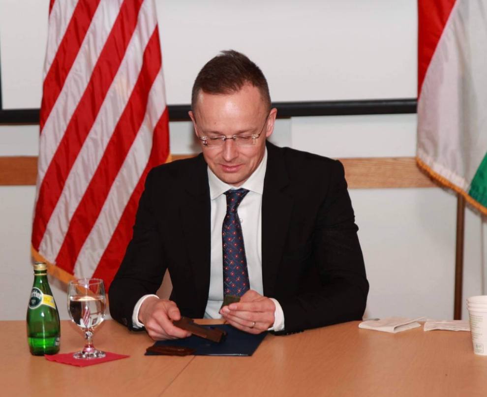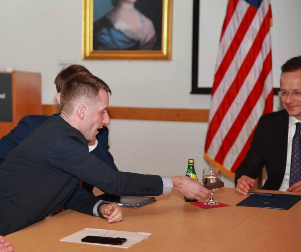 Олексій Прокопенко, CEO Фонду HUCUS у Гарварді, подарував міністру закордонних справ Угорщини Петеру Сійярто фрагмент російського танку, спаленого в Україні у битві за Київ.