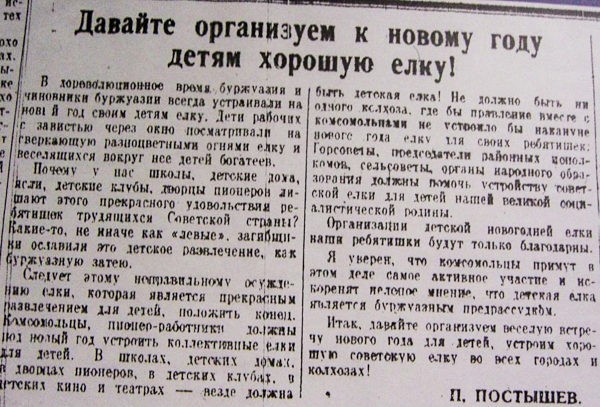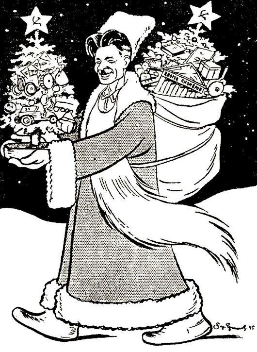 Постишев не вникав у міфи – взяв російську казку 1838-го “Мороз Іванович” Володимира Одоєвського: сивий дід у крижаному домі, що карає ледачих і винагороджує працьовитих. Виховна казка для “господинь”. Радянська пропаганда зробила його “веселим” дідом у червоному (кольору комуністичного стяга) вбранні, зі Снігуронькою (замість ангелів), червоною п’ятикутною зіркою замість вифлеємської восьмикутної. Іграшки – Ленін, Сталін, серп і молот (а між рядками – голод, репресії та масові убивства).