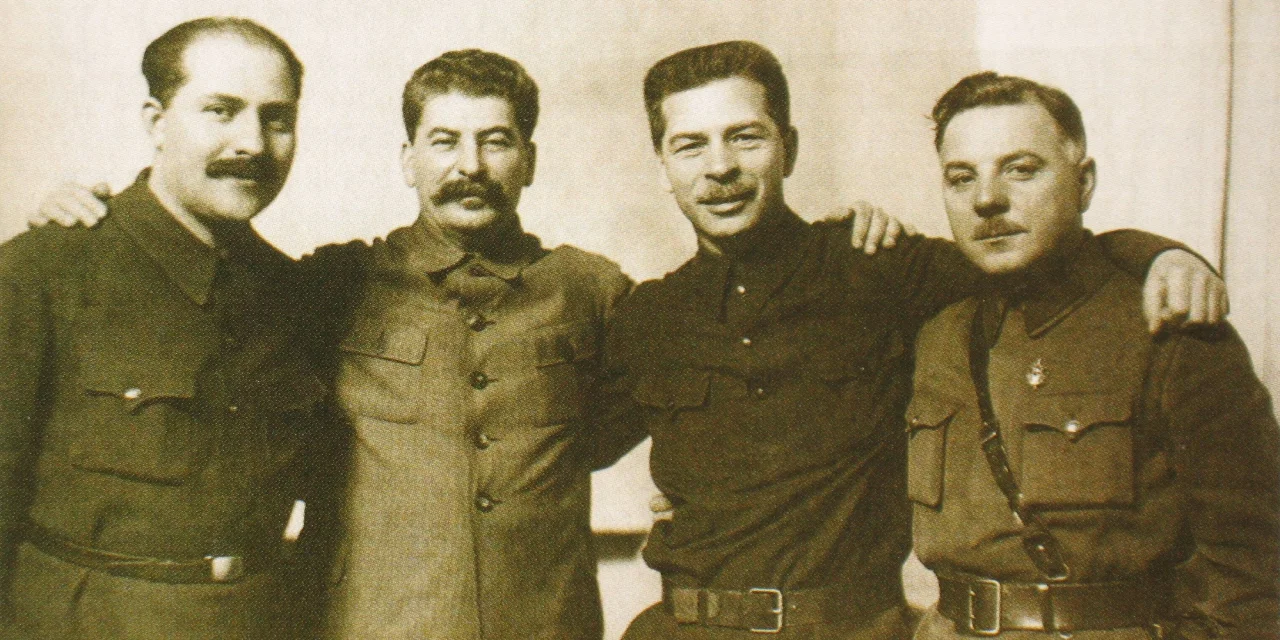 Лазар Каганович, Йосип Сталін, Павло Постишев і Климент Ворошилов.