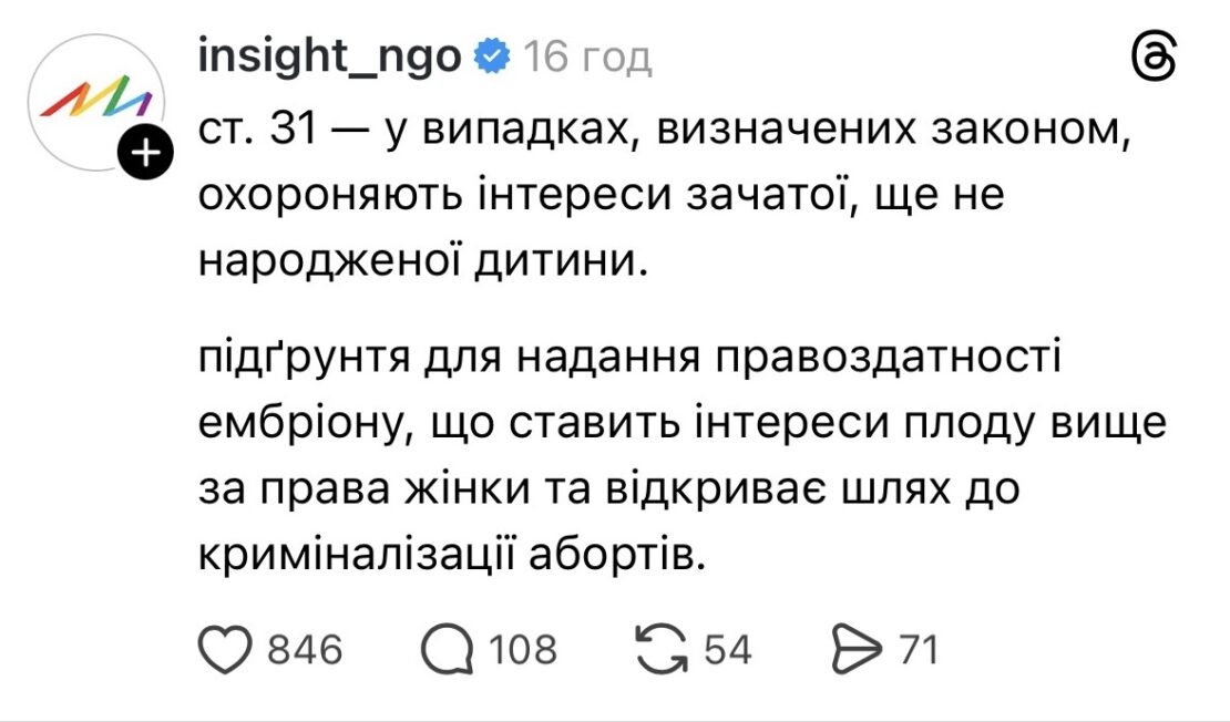 ГО “Інсайт”, яка стверджує, що проаналізувала проєкт нового Цивільного кодексу України, на своїх сторінках у соцмережах навела приклади деяких його норм, які, на думку експерток ГО, є відкатом назад, порівняно з чинним ЦКУ. Наприклад, згадується стаття 31 проєкту, де нібито закладається підґрунтя для надання правоздатності ембріона, інтереси плоду ставляться вище за права жінки та відкривається шлях до криміналізації абортів.