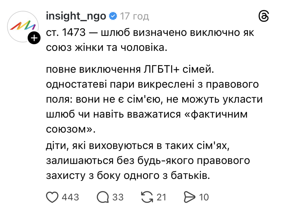 Повернемось до аналізу, запропонованого ГО “Інсайт”. Згадується стаття 1473 проєкту нового ЦКУ, яка визначає шлюб як союз чоловіка і жінки. Можна сперечатись з таким обмеженням (в Конституції воно сформульовано не так радикально, до речі), але не можна заперечувати, що проєкт нового ЦКУ і тут нічого нового не привносить. Тому що стаття 21 чинного Сімейного кодексу України каже нам, що “Шлюбом є сімейний союз жінки та чоловіка, зареєстрований у органі державної реєстрації актів цивільного стану”.