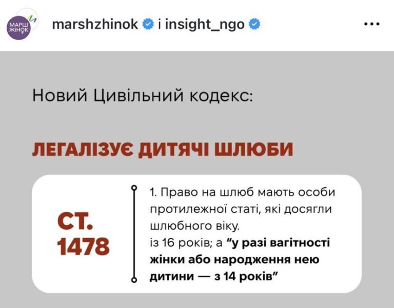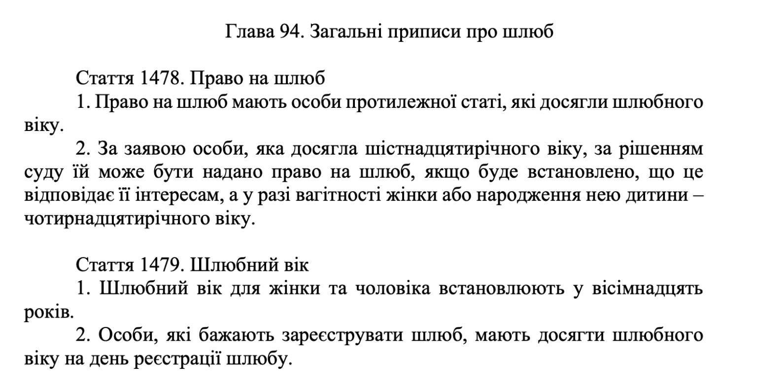 Найгострішу реакцію викликала, мабуть, стаття 1478 нового ЦКУ, яка нібито легалізує дитячі шлюби. Що ж, тут авторки аналізу частково праві – норми, які пропонує проєкт нового ЦКУ дійсно відсутні в українському законодавстві з 2012 року, коли до Сімейного кодексу внесли зміни щодо підвищення шлюбного віку. У чинній редакції СКУ вступити у шлюб (незалежно від статі) виключно за рішенням суду можна не з 14, а з 16 років, якщо це відповідає інтересам неповнолітньої особи, яка подала таку заяву.