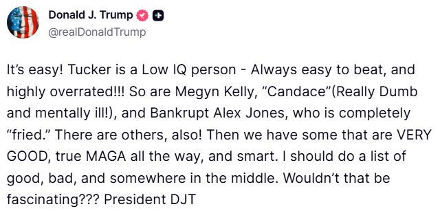 “Це просто! Такер — людина з низьким IQ — його завжди легко перемогти, і його сильно переоцінюють!!! Так само як і Мегін Келлі, “Кендес” (справжня дурепа і психічно хвора!) та збанкрутілий Алекс Джонс, який повністю “згорів”. Є й інші теж! А ще є ті, хто дуже хороші, справжні прихильники MAGA до кінця і розумні. Мені слід скласти список хороших, поганих і тих, хто десь посередині. Хіба це не було б цікаво???” – написав Трамп.