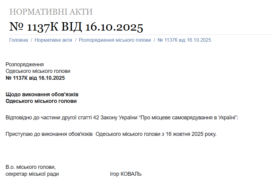 З 16 жовтня обов’язки міського голови Одеси виконує секретар Одеської міської ради Ігор Коваль.