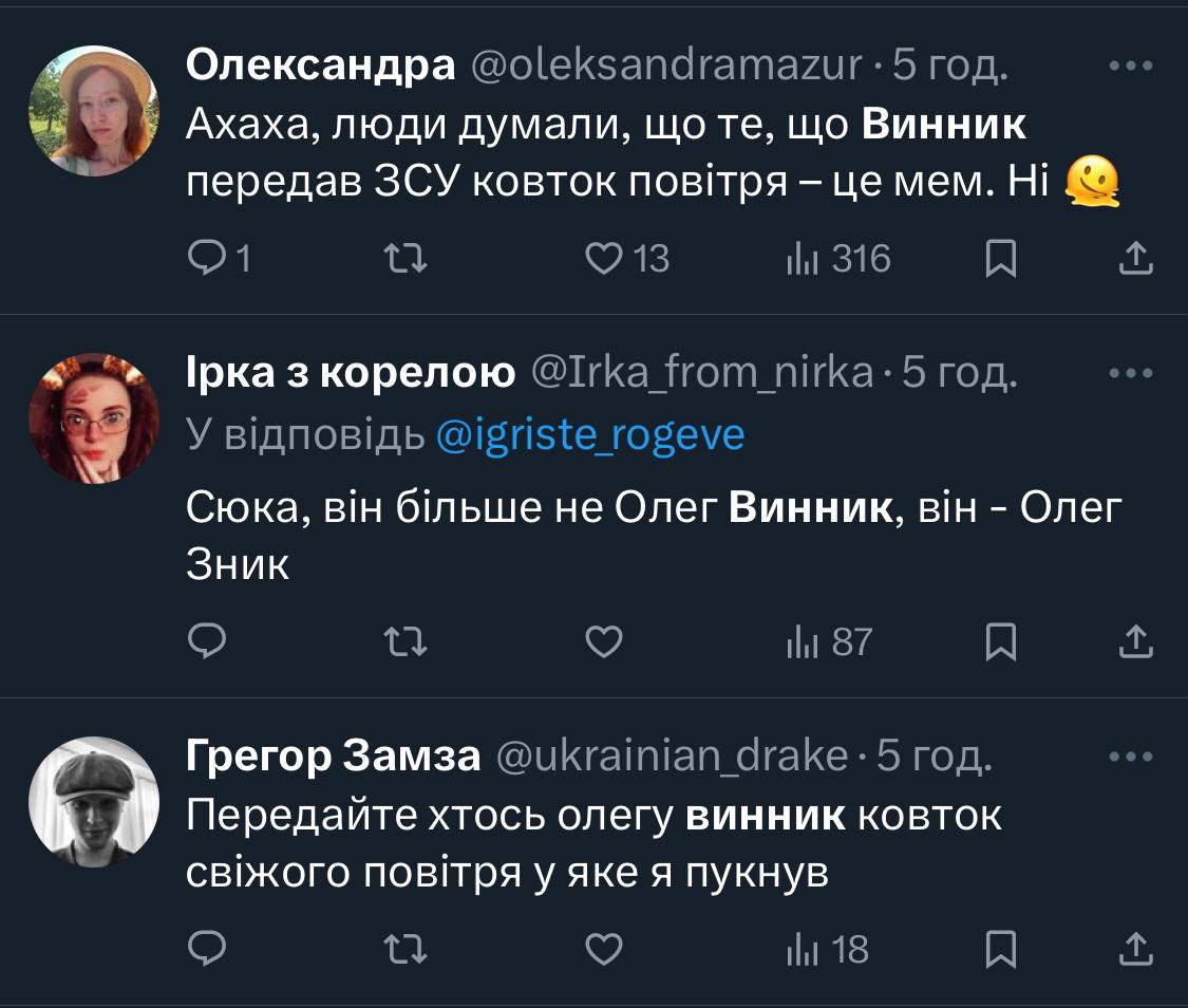 Український співак Олег Винник, який зараз перебуває в Німеччині, “передав” українцям та особливо ЗСУ “ковток свіжого повітря”, що викликало неоднозначну реакцію в користувачів соцмереж.
