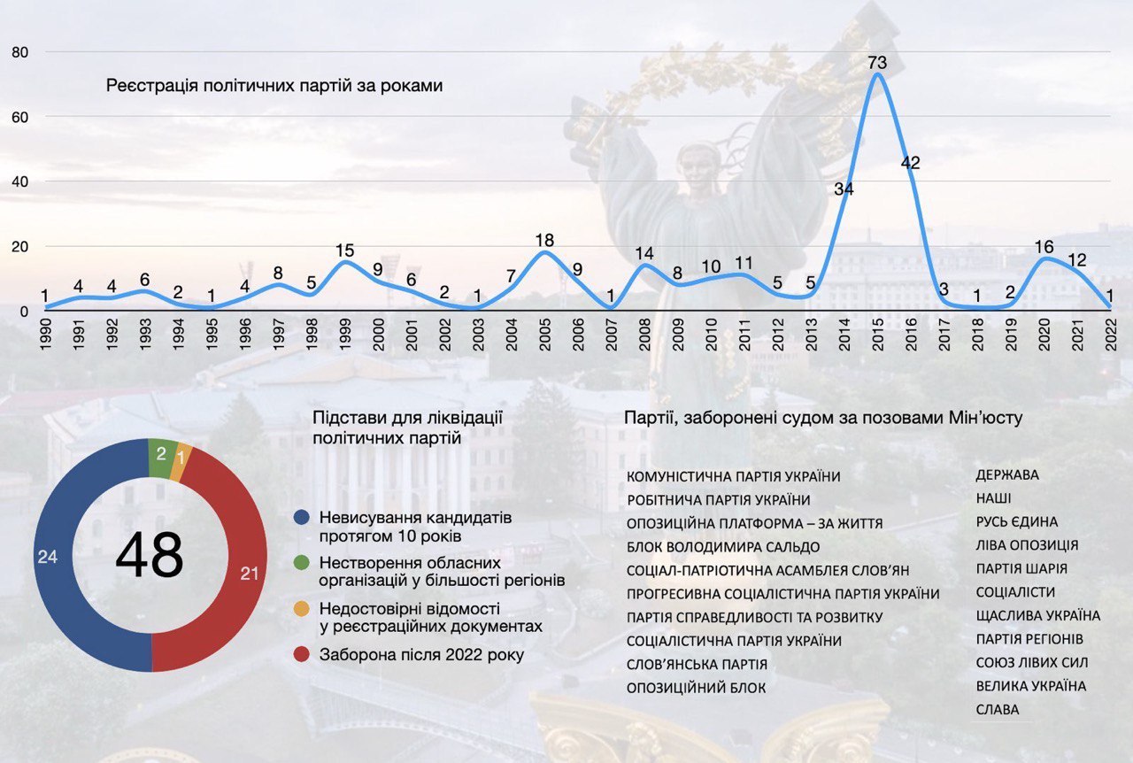 Сьогодні в Україні діє 340 політичних партій, причому піки їх реєстрації історично збігалися з виборами та змінами влади, а абсолютний рекорд було встановлено у 2015 році — 73 нові партії –  пише у колонці “Української правди” адвокат Володимир Богатир, описуючи трансформацію функцій держави у регулюванні політичних партій – від пасивного реєстратора до активного регулятора.