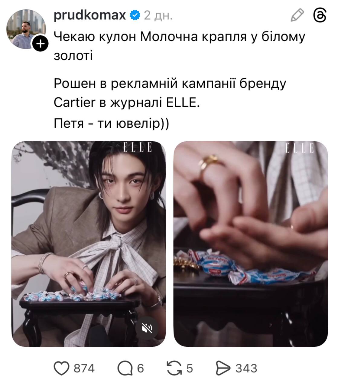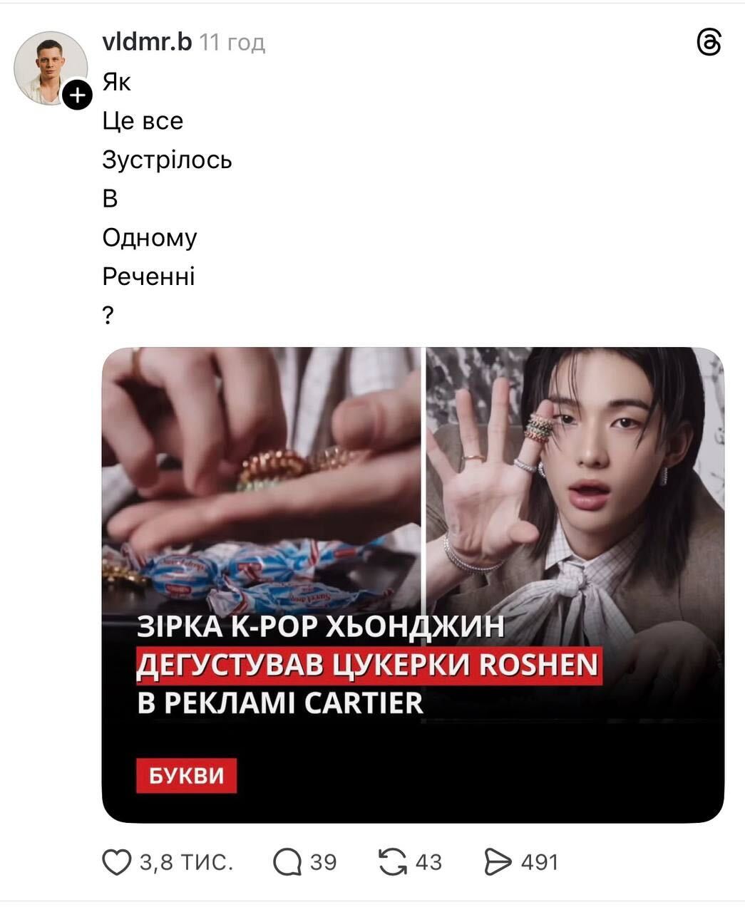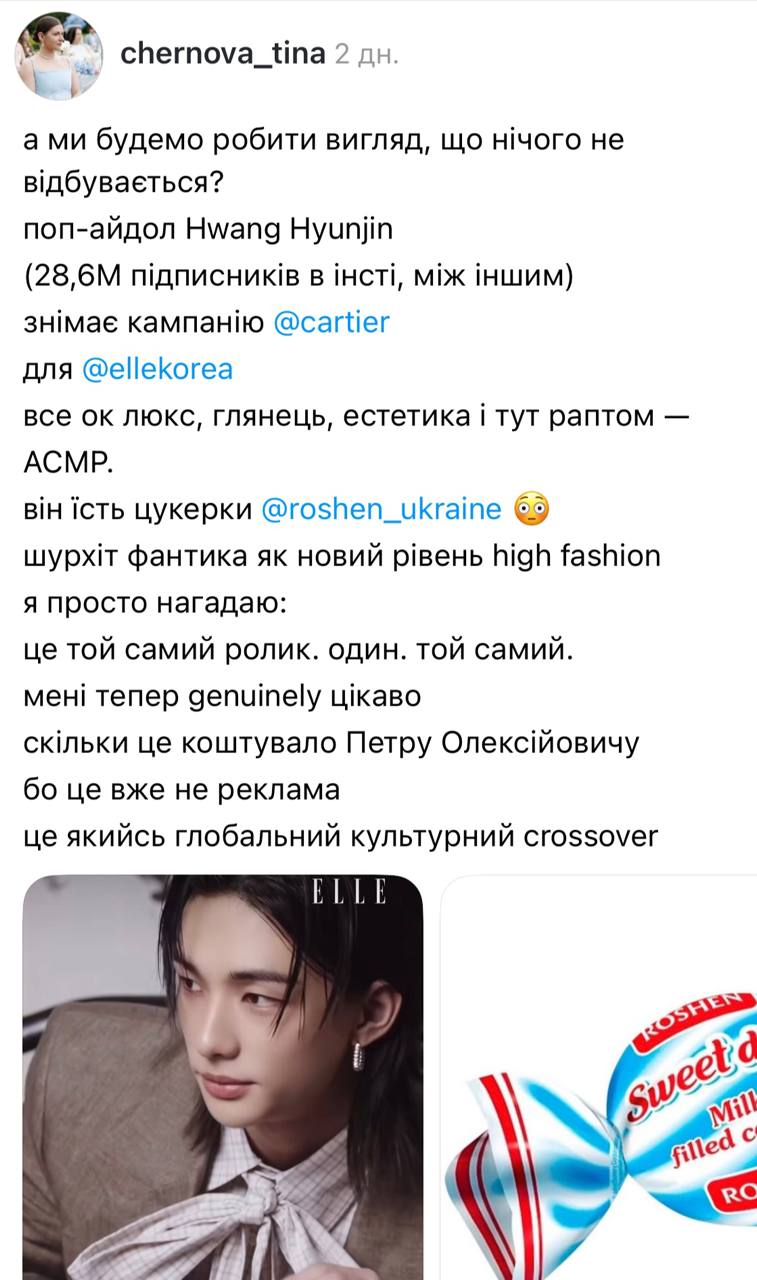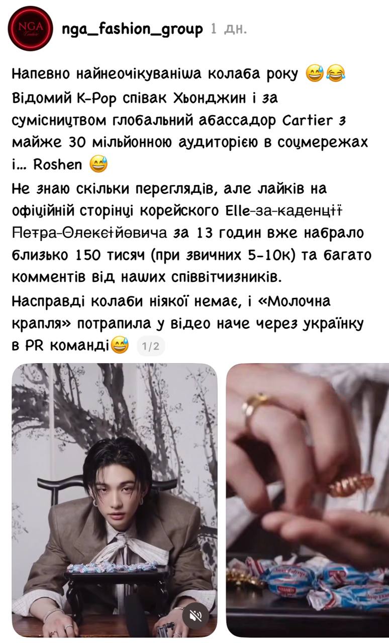 Українці у мережі зреагували хвилею мемів і жартів на появу цукерок Roshen у рекламній кампанії ювелірного дому Cartier за участі учасника гурту Stray Kids Хвана Хьонджіна.