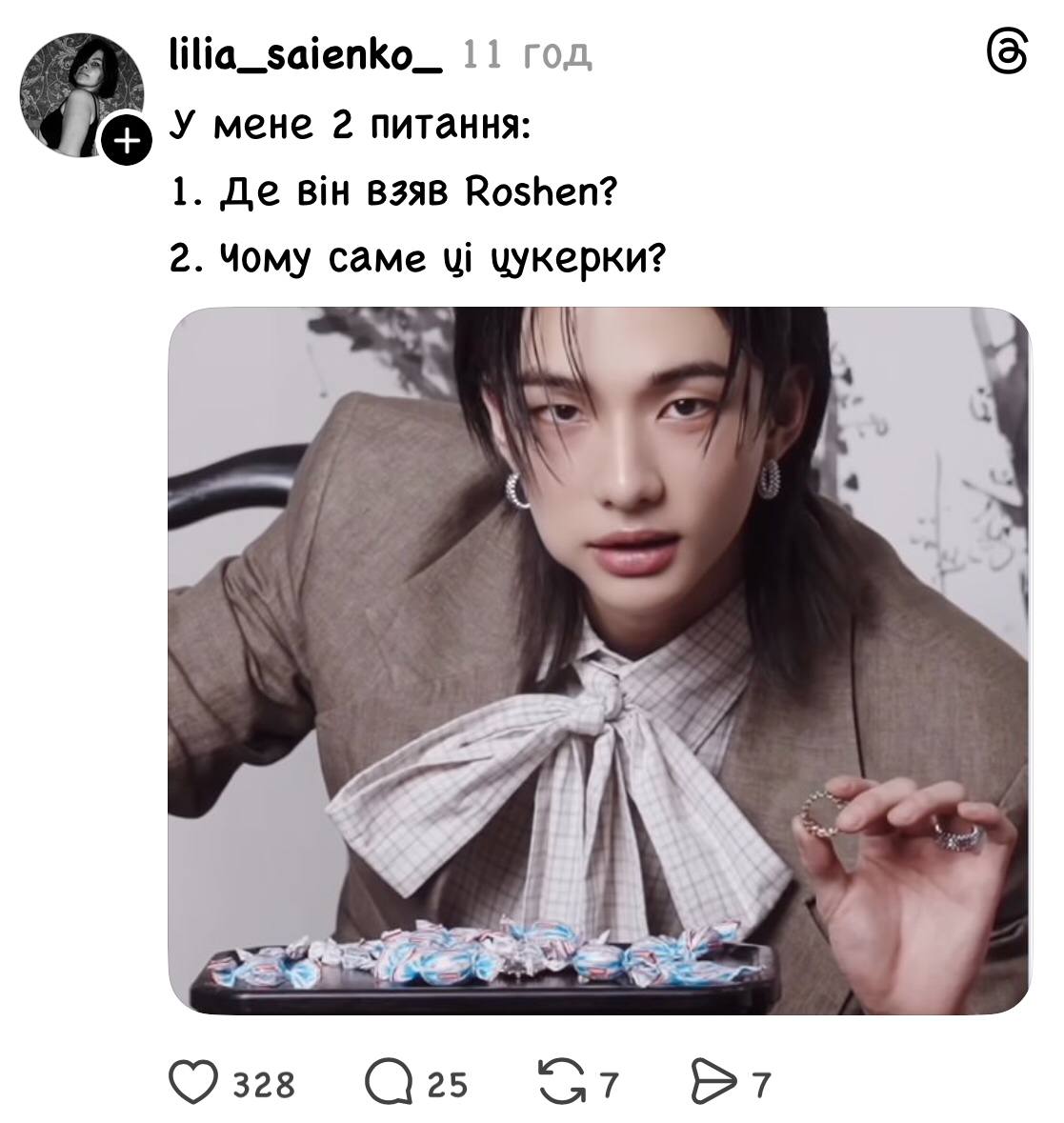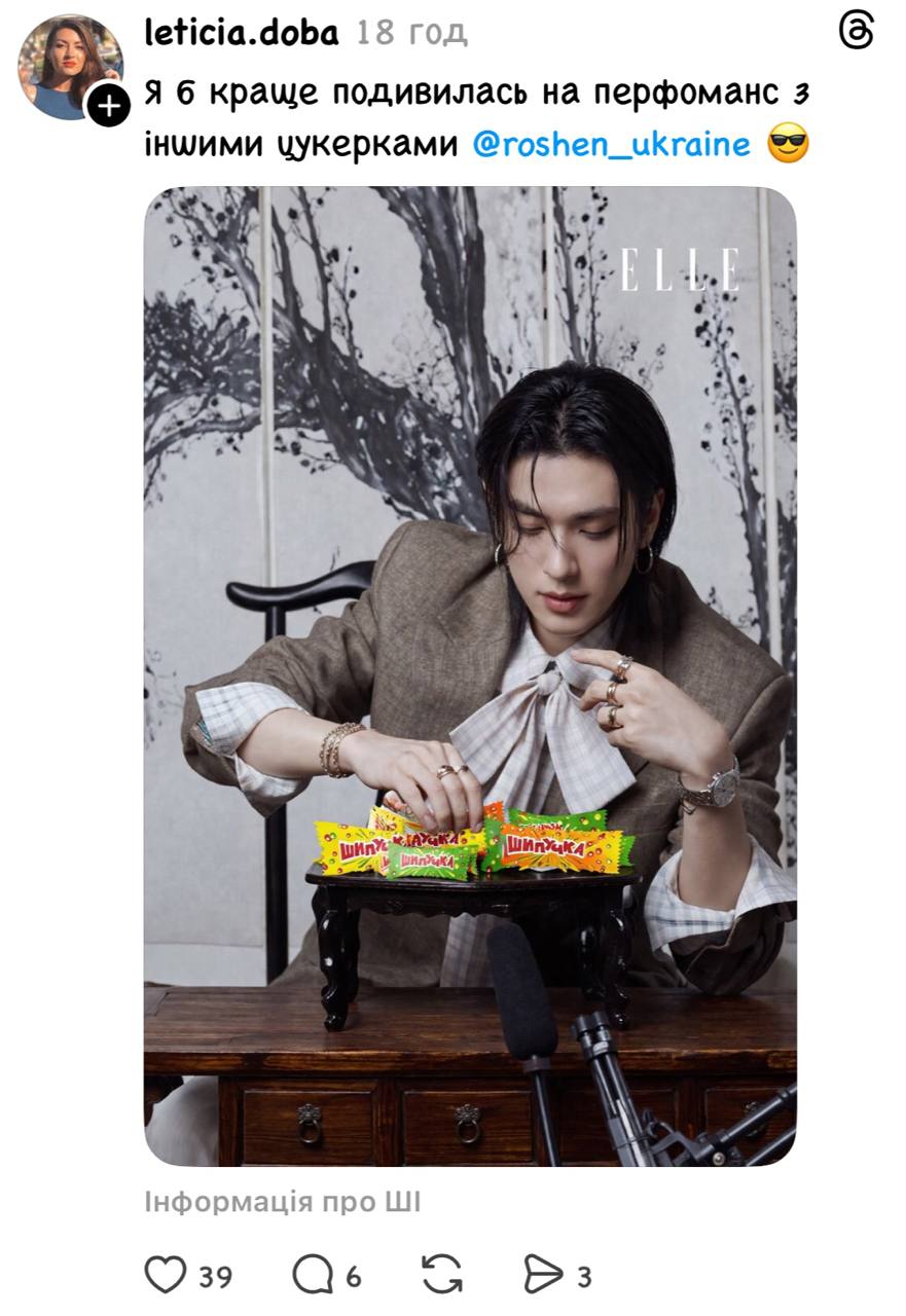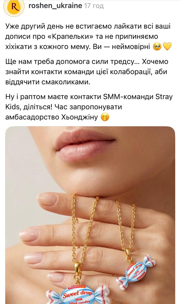 Проте серед українських фанатів айдола найбільше обговорюють не лише ювелірні прикраси, а й несподіваний “гостинець” у кадрі – цукерку Roshen “Молочна крапля”.