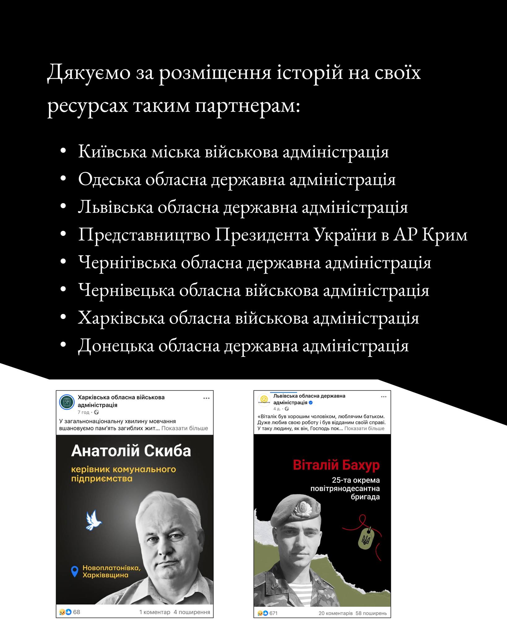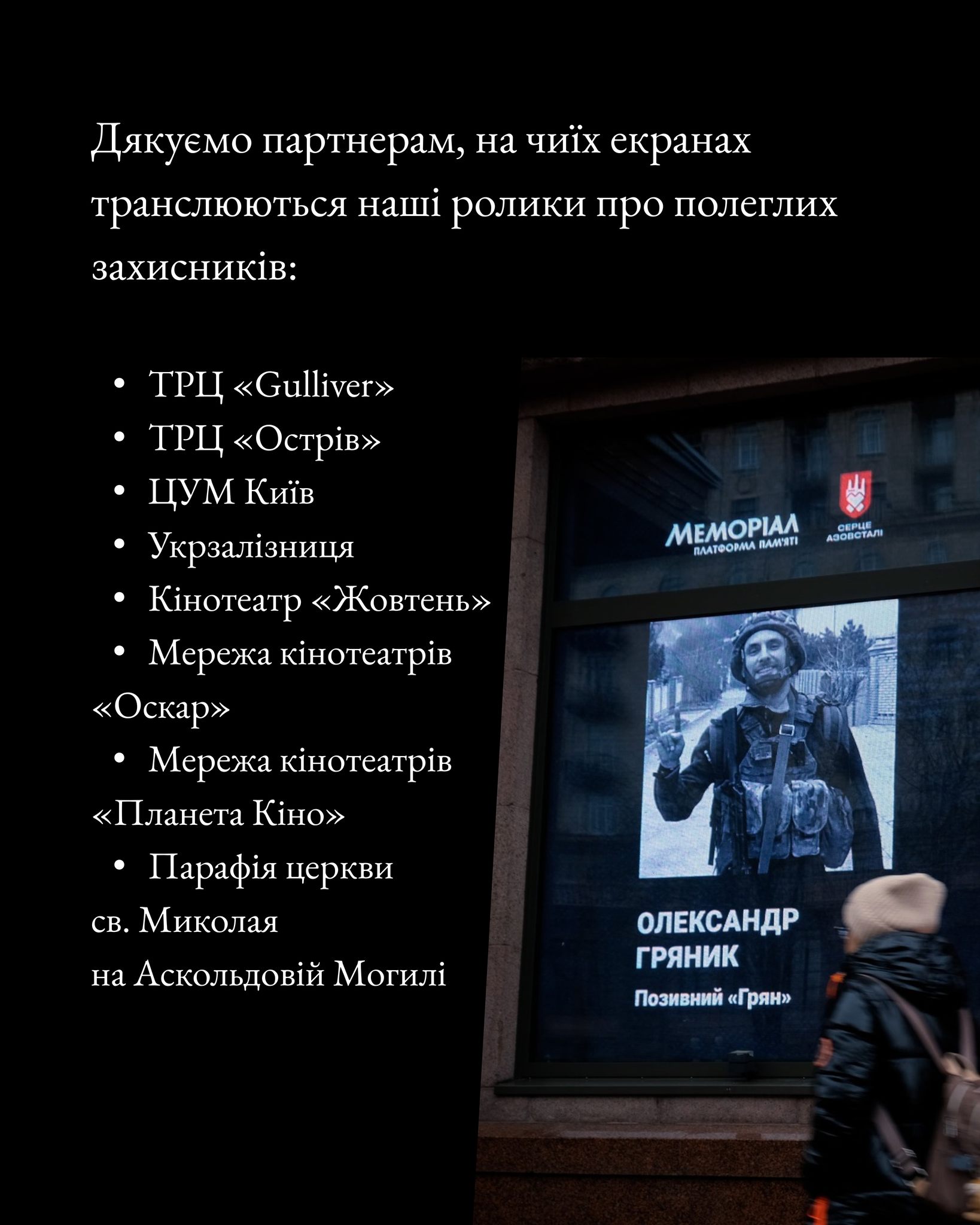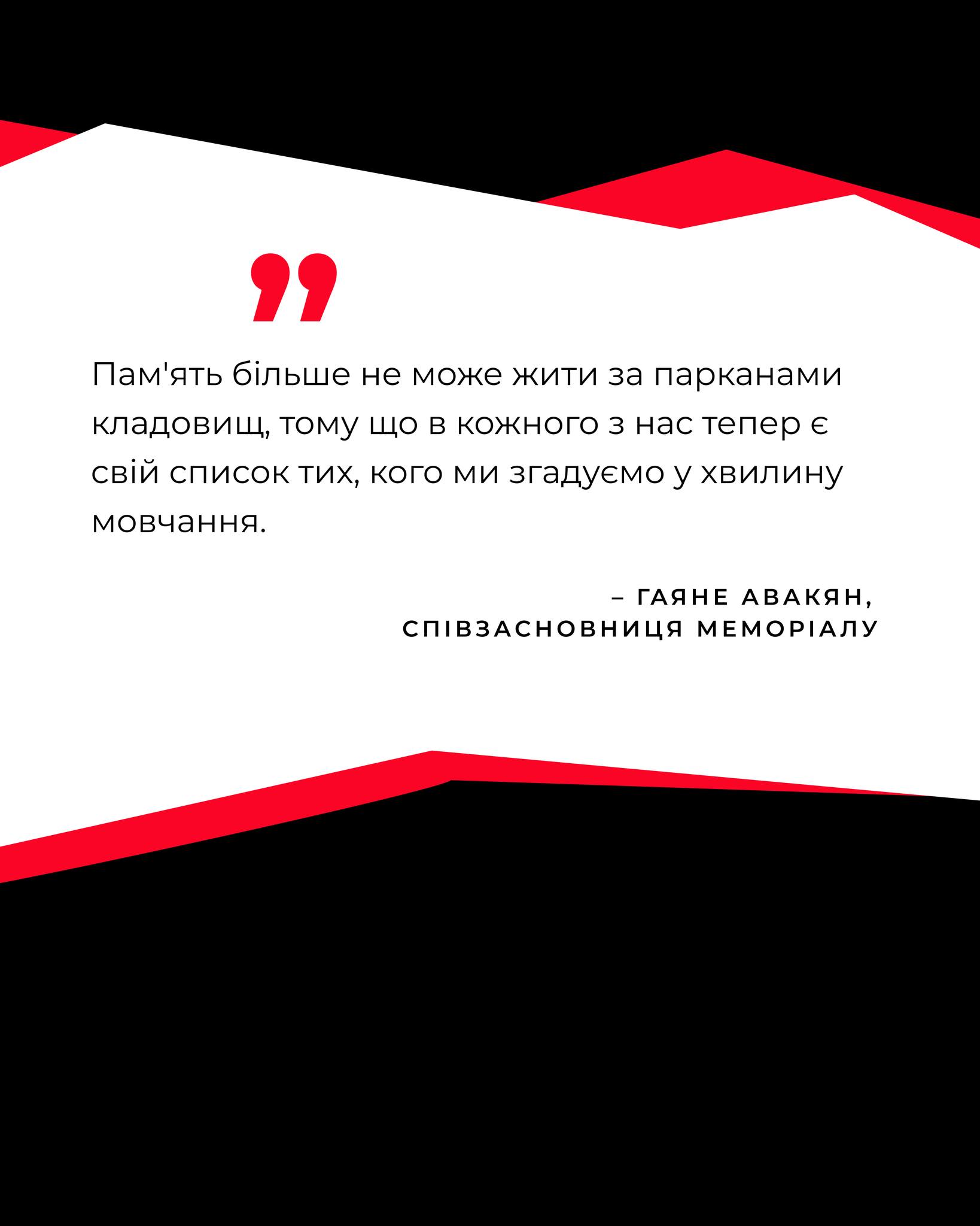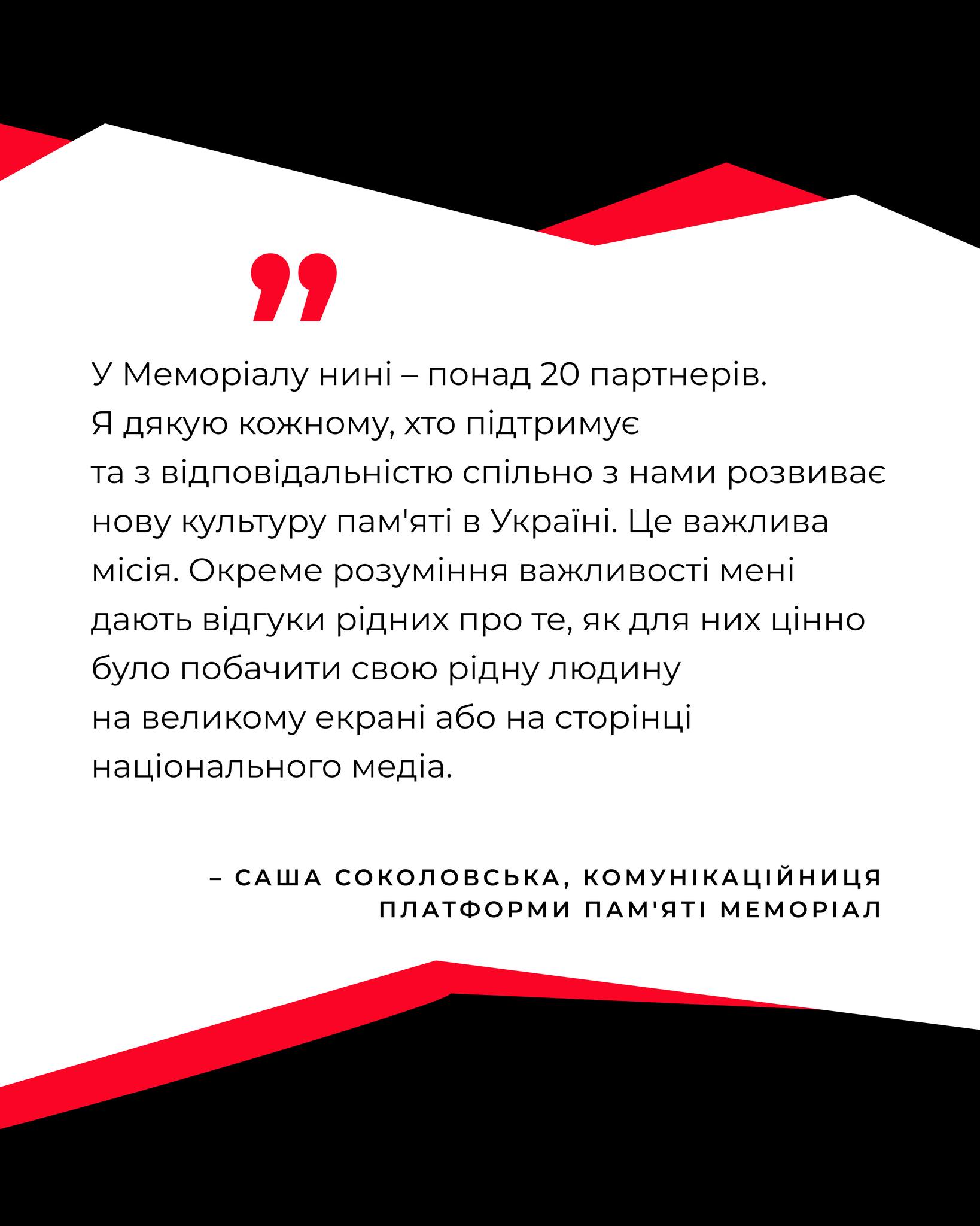 У Меморіалу нині – понад 20 партнерів. Я дякую кожному, хто підтримує та розвиває нову культуру пам’яті в Україні. Це важлива місія. Окреме розуміння важливості мені надають відгуки рідних про те, як для них цінно було побачити гідне вшанування рідної людини, – розповіла комунікаційниця Меморіалу Саша Соколовська.