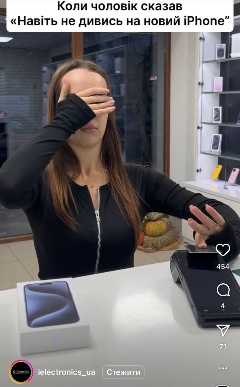Інтернет-магазин @ielectronics вирішив нагадати українцям про традицію сексистської реклами: якщо дівчина забажала Iphone — вона має підготуватися. Таку “креативну” ідею продавці втілили в одному з останніх відеороликів на своїй сторінці в Instagram.