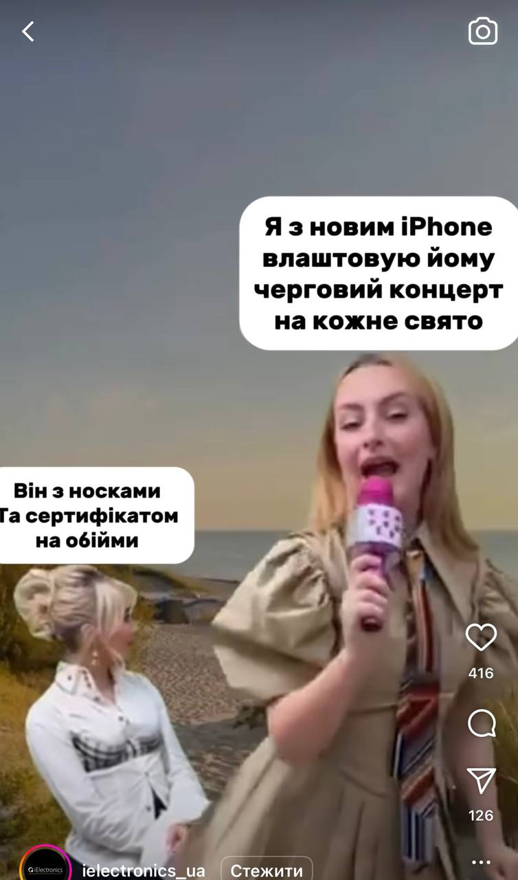 Магазин @ielectronics нагадав: сексистська реклама нікуди не ділася. Ролик з приготуваннями “нас*октати на iphone” смм-ники магазину виклали на сторінку в інсті. Сторінка має 284 тисячі підписників, рилзи набирають по 50, 100 і 200 тисяч переглядів.