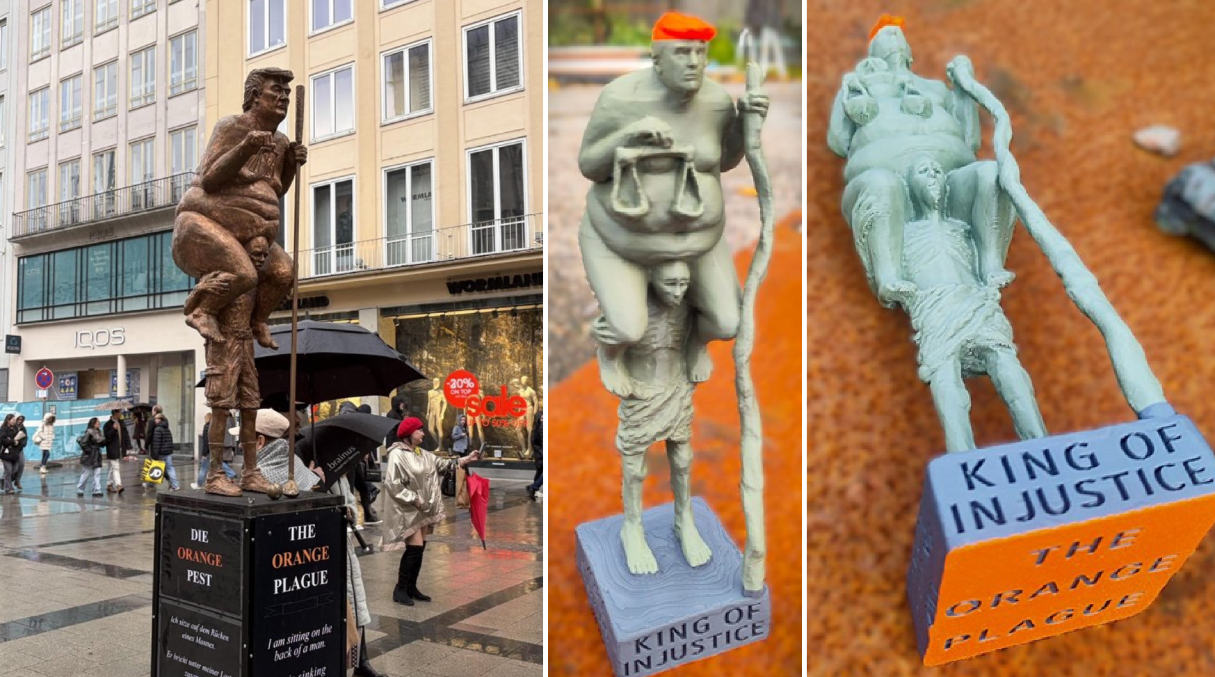 У центрі Мюнхена з’явився незвичний арт-об’єкт, прямо під час проведення щорічної конференції з безпеки. Данський скульптор Єнс Галшіот представив свою нову роботу “Помаранчева чума” (The Orange Plague) – триметрову бронзову інсталяцію, що зображує Дональда Трампа в образі вершника на спині худого, виснаженого молодого чоловіка.
