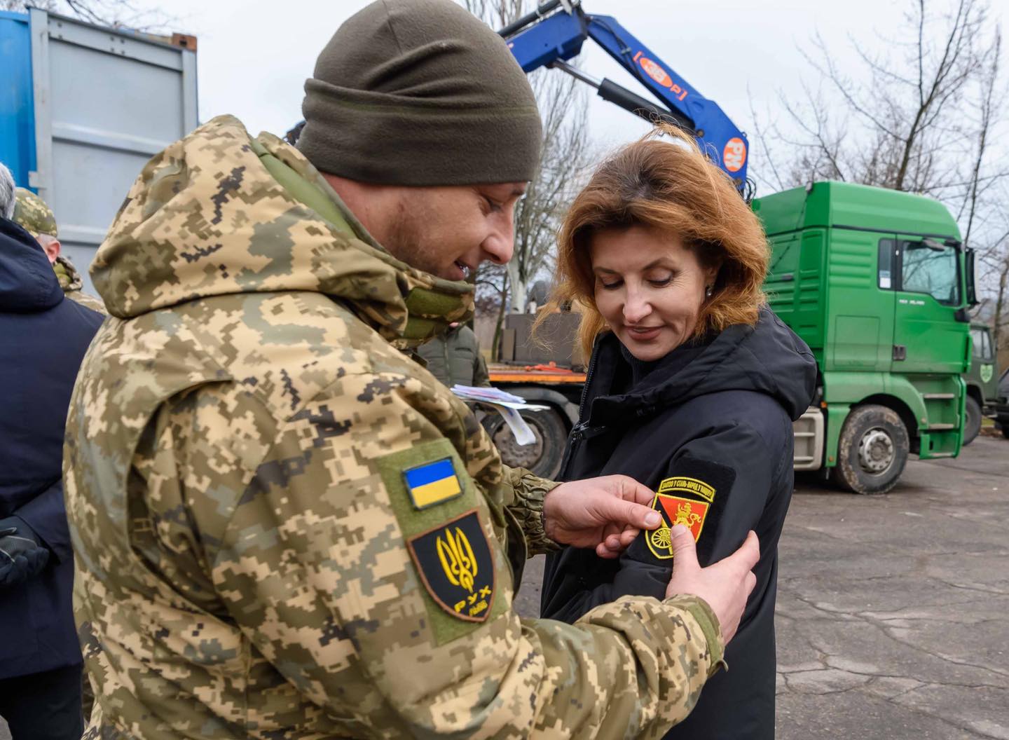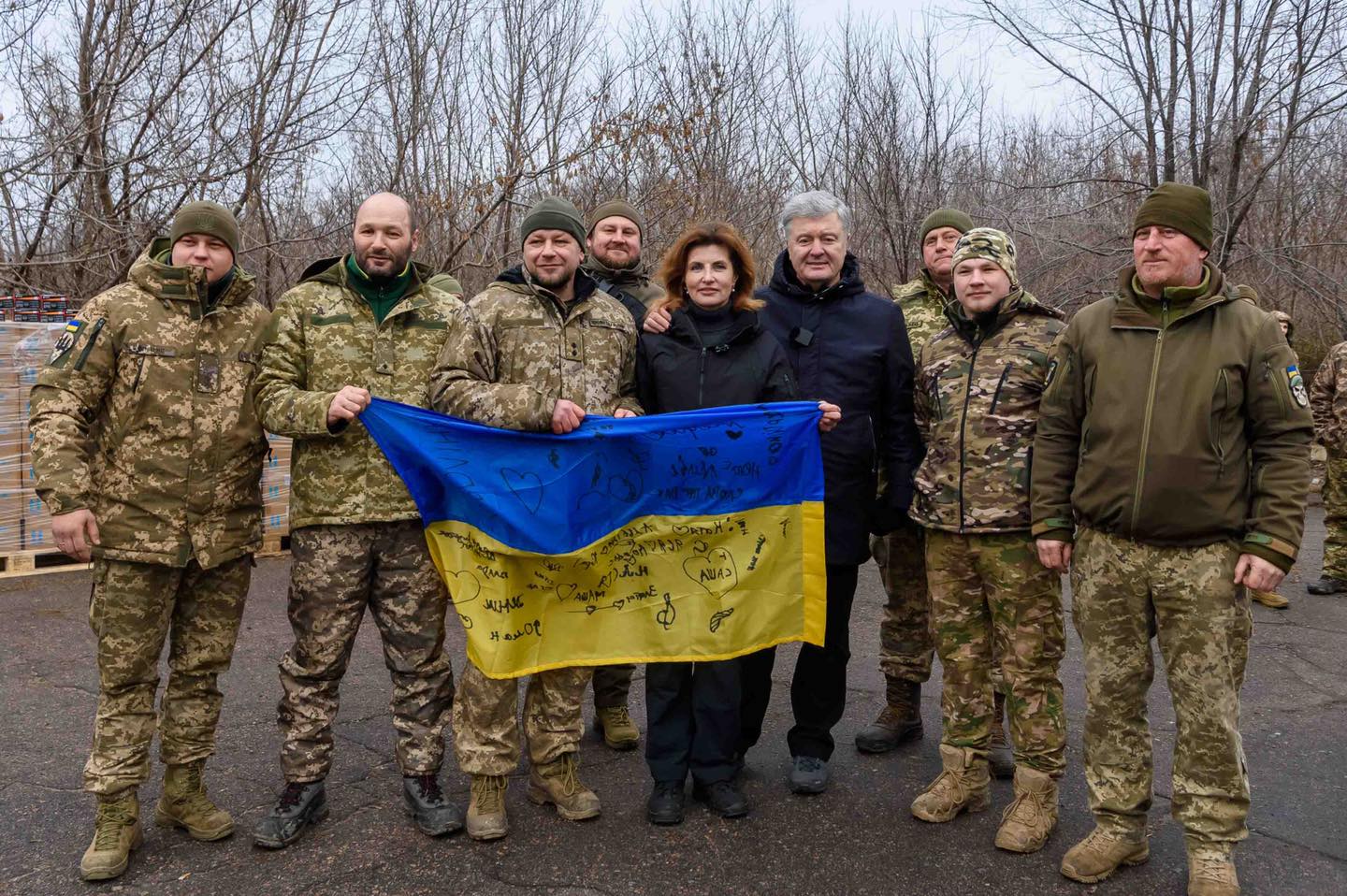Своєю чергою, Марина Порошенко також передала військовим прапори, які напередодні підписали діти з селища Дніпровське: “ми вчора вітали дітей з новорічно-різдвяними святами. І коли я запитала, яка у них мрія, всі одностайно закричали – Перемога”.