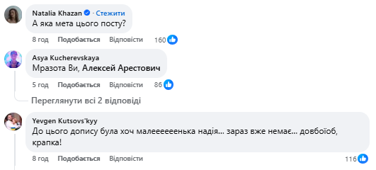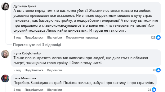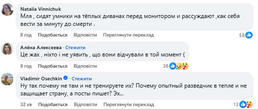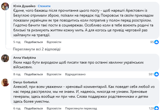 “Чи повзав би Арестович на колінах? Або ж голими руками всіх переміг?”, “Легко судити по відео, сидячи в теплі”, “Дивне зміщення акцентів на по суті “самі винуваті”.