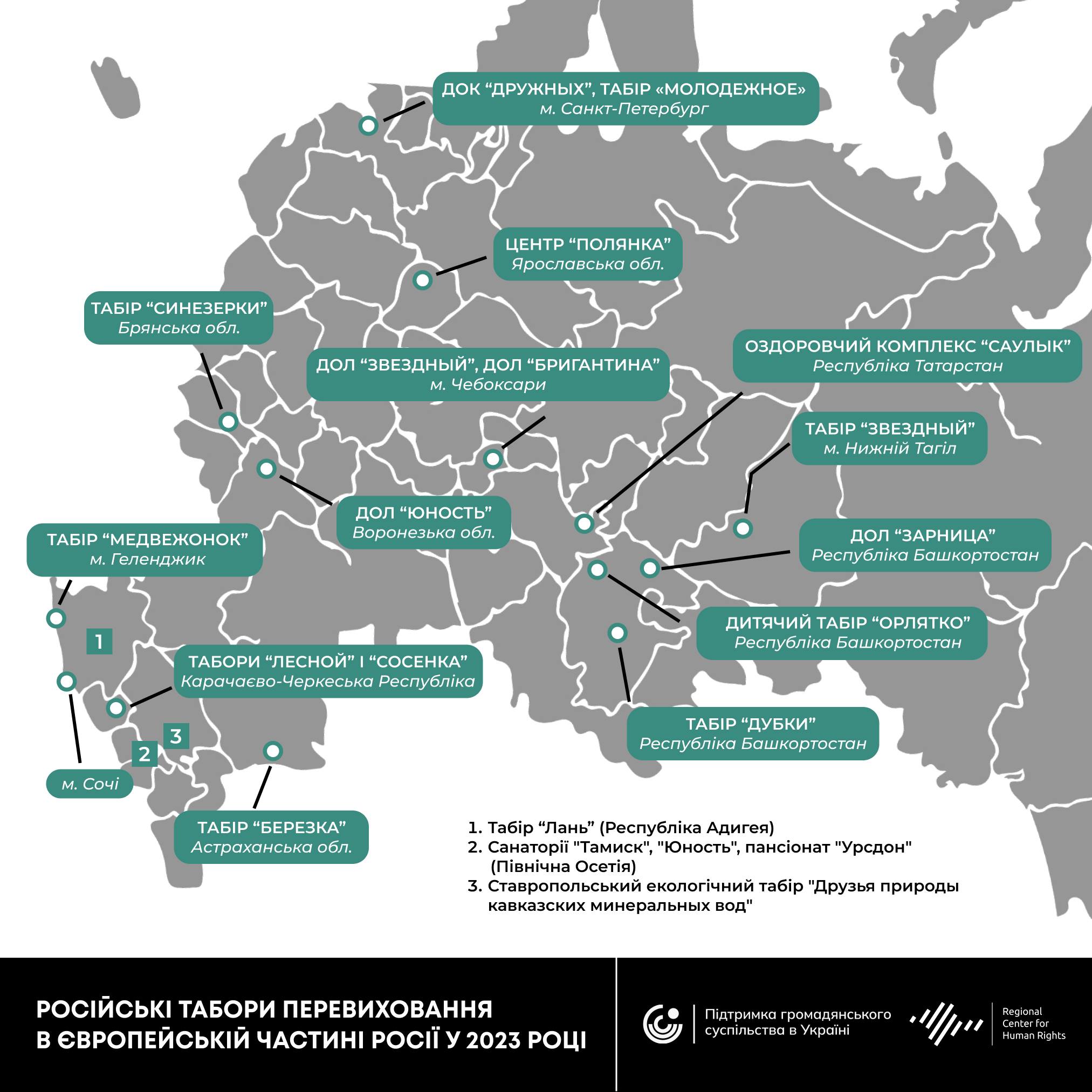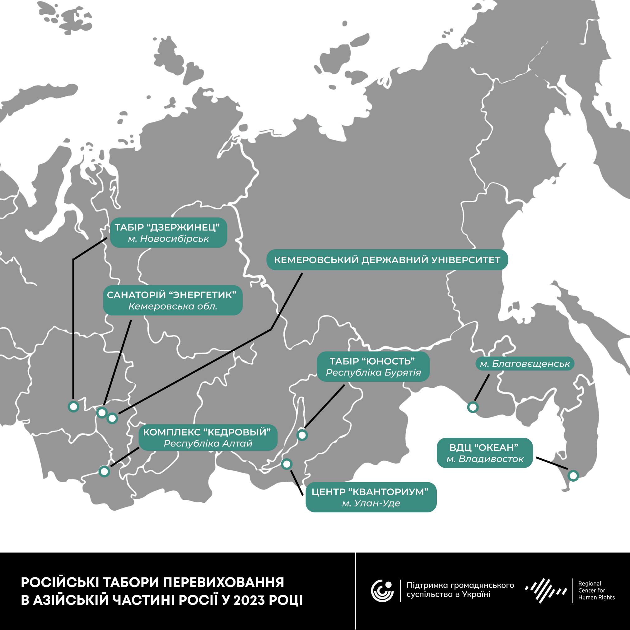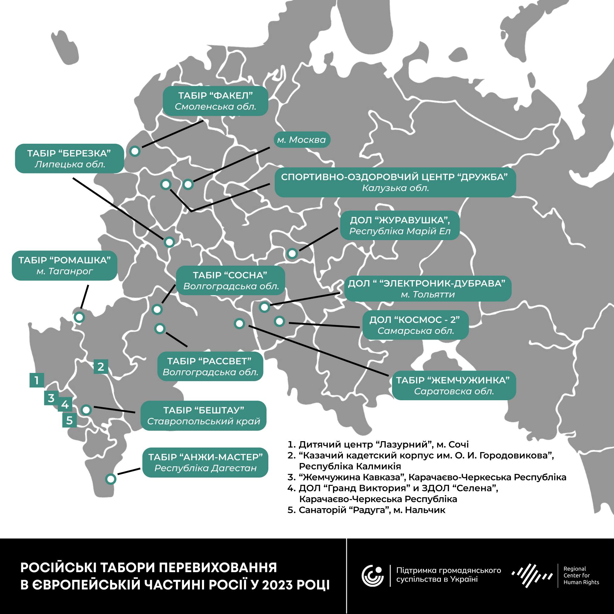 Регіональний центр прав людини продовжив минулорічне розслідування і з відкритих джерел встановив місцезнаходження так званих “таборів перевиховання” в РФ для українських дітей з ТОТ. На сьогодні виявили 13 установ на окупованій території України, ще 18 — у Білорусі та 67 — у Росії.