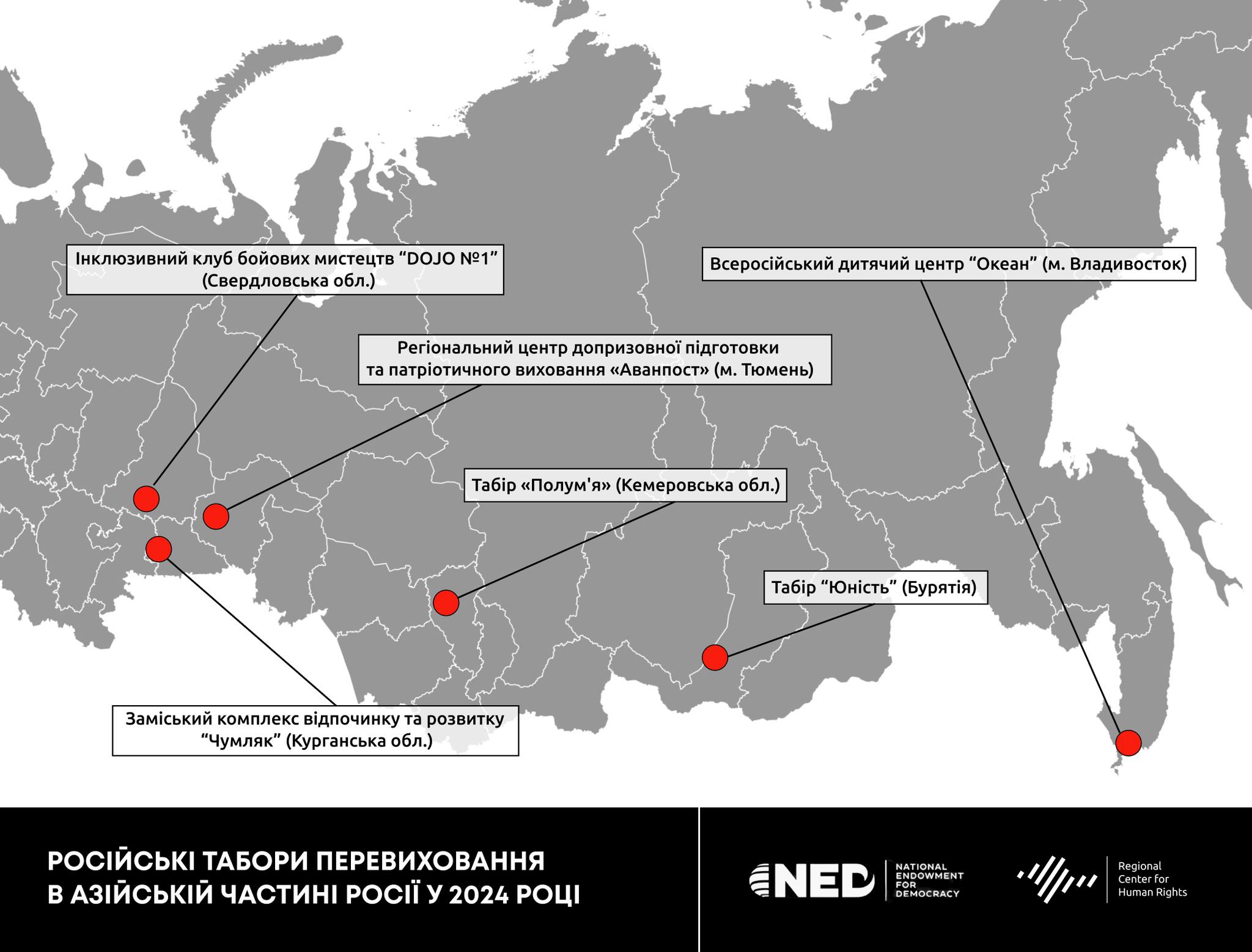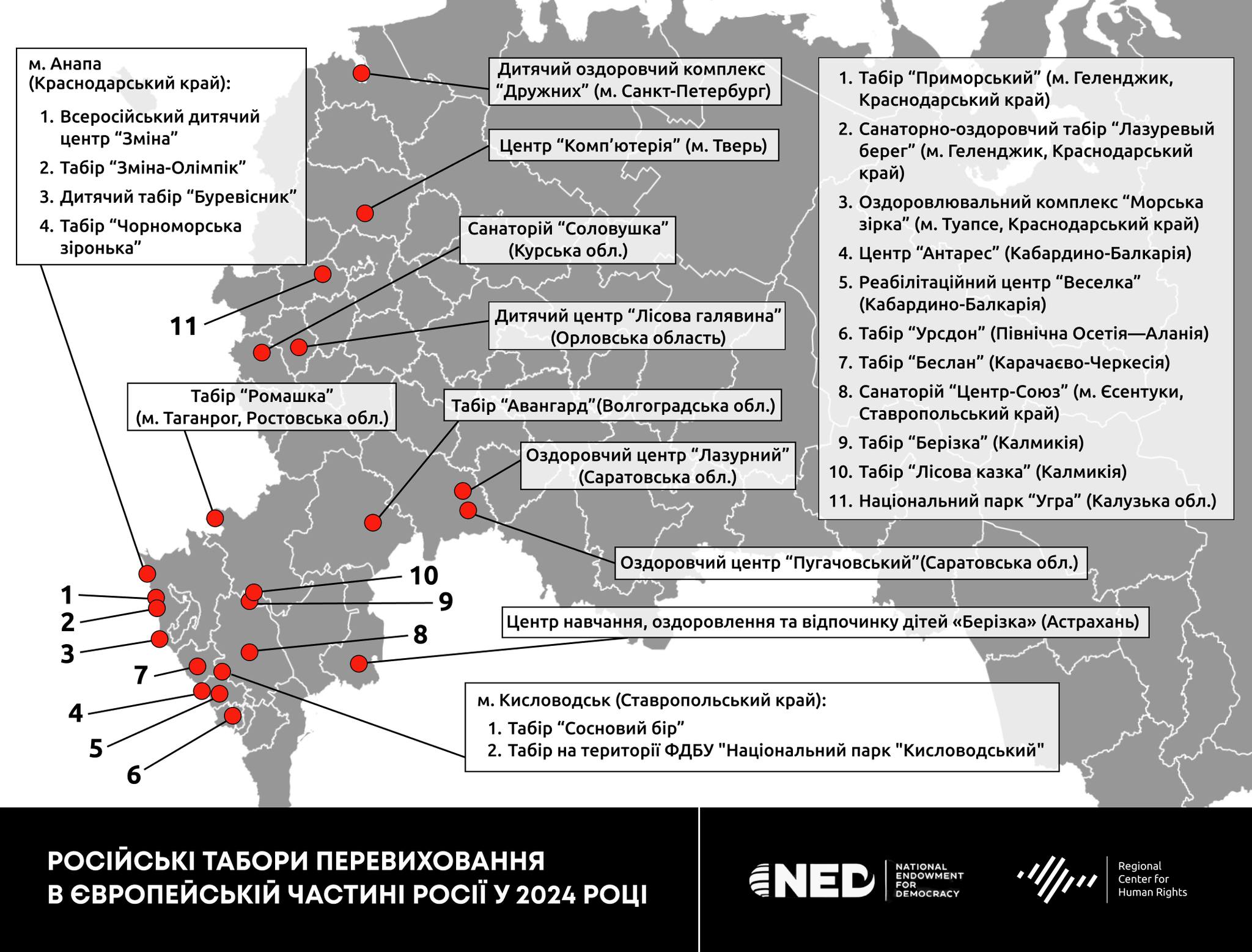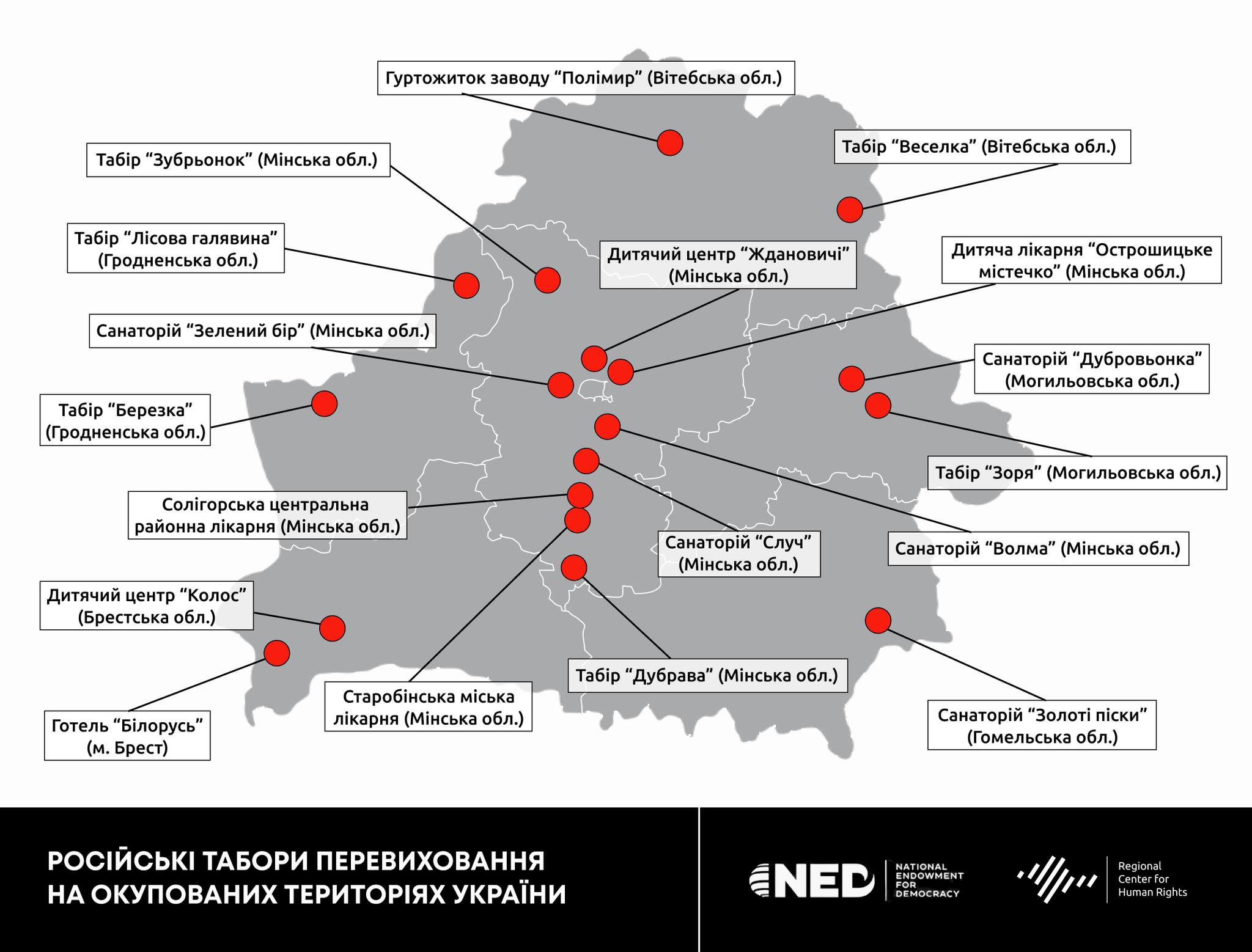 Регіональний центр прав людини продовжив минулорічне розслідування і з відкритих джерел встановив місцезнаходження так званих “таборів перевиховання” в РФ для українських дітей з ТОТ. На сьогодні виявили 13 установ на окупованій території України, ще 18 — у Білорусі та 67 — у Росії.