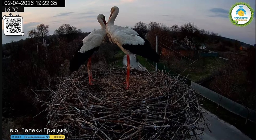 Близько 12:37 до гнізда прилетіла Одарка – колишня господарка. На той момент оселя була порожньою, тож птаха одразу поводилася як власниця: привіталася характерним клекотом і влаштувалася в гнізді, розправивши крила.