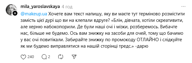 Після хвилі обурення “Makeup” видалив ролик і перепросив за те, що публікація “була сприйнята не так, як ми задумували”. В компанії додали, що це відео – не реклама. Однак, вибачення компанії теж розкритикували.