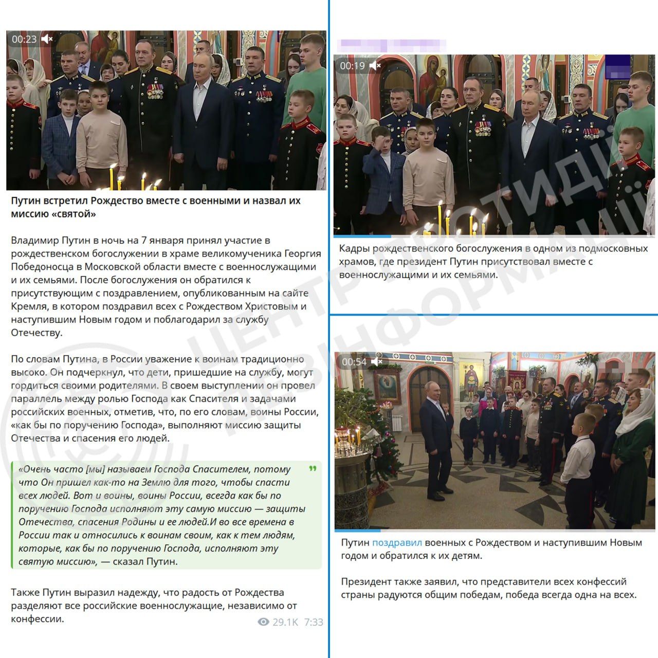 Як зазначили у Центрі протидії дезінформації, Путін “зустрів Різдво разом із військовими та їхніми сім’ями, використавши церковну службу для того, щоб вчергове виправдати війну проти України”.
