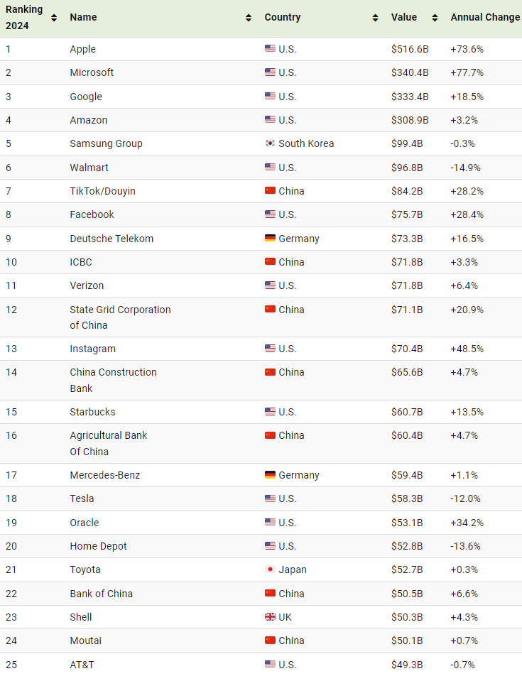 У 2024 році більш ніж половина зі 100 найдорожчих брендів базуються в Сполучених Штатах, їх сукупна вартість становить 3,2 трильйона доларів.