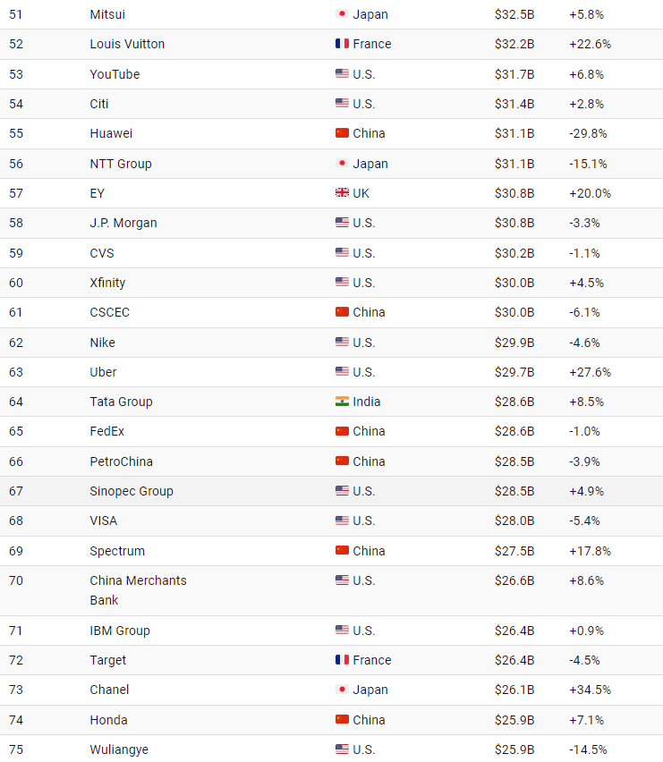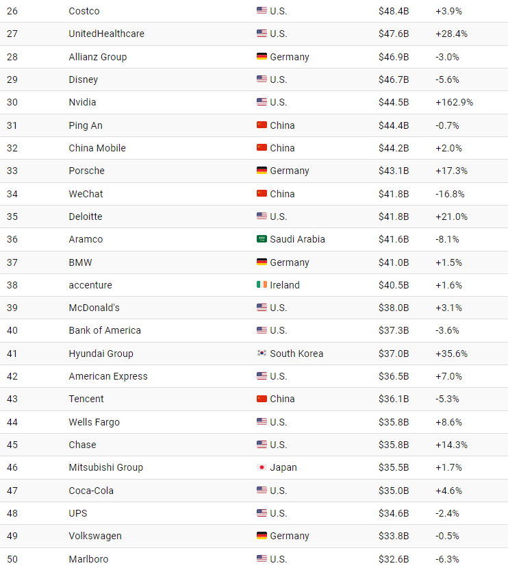 Китай посідає друге місце за кількістю компаній у рейтингу, а найдорожчим брендом є TikTok у 84,2 мільярда доларів. Цікаво, що багато найдорожчих брендів Китаю переважно зосереджені у фінансовому секторі.