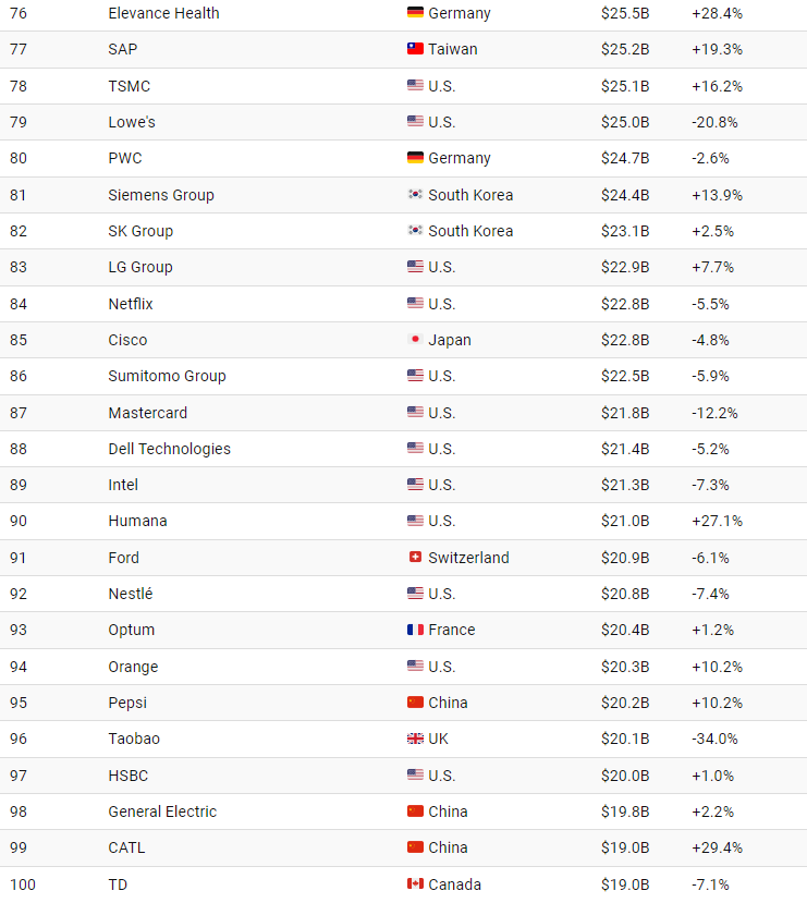 Для візуалізації вартості 100 найкращих брендів у Visual Capitalist  використали дані щорічного глобального рейтингу від Brand Finance.