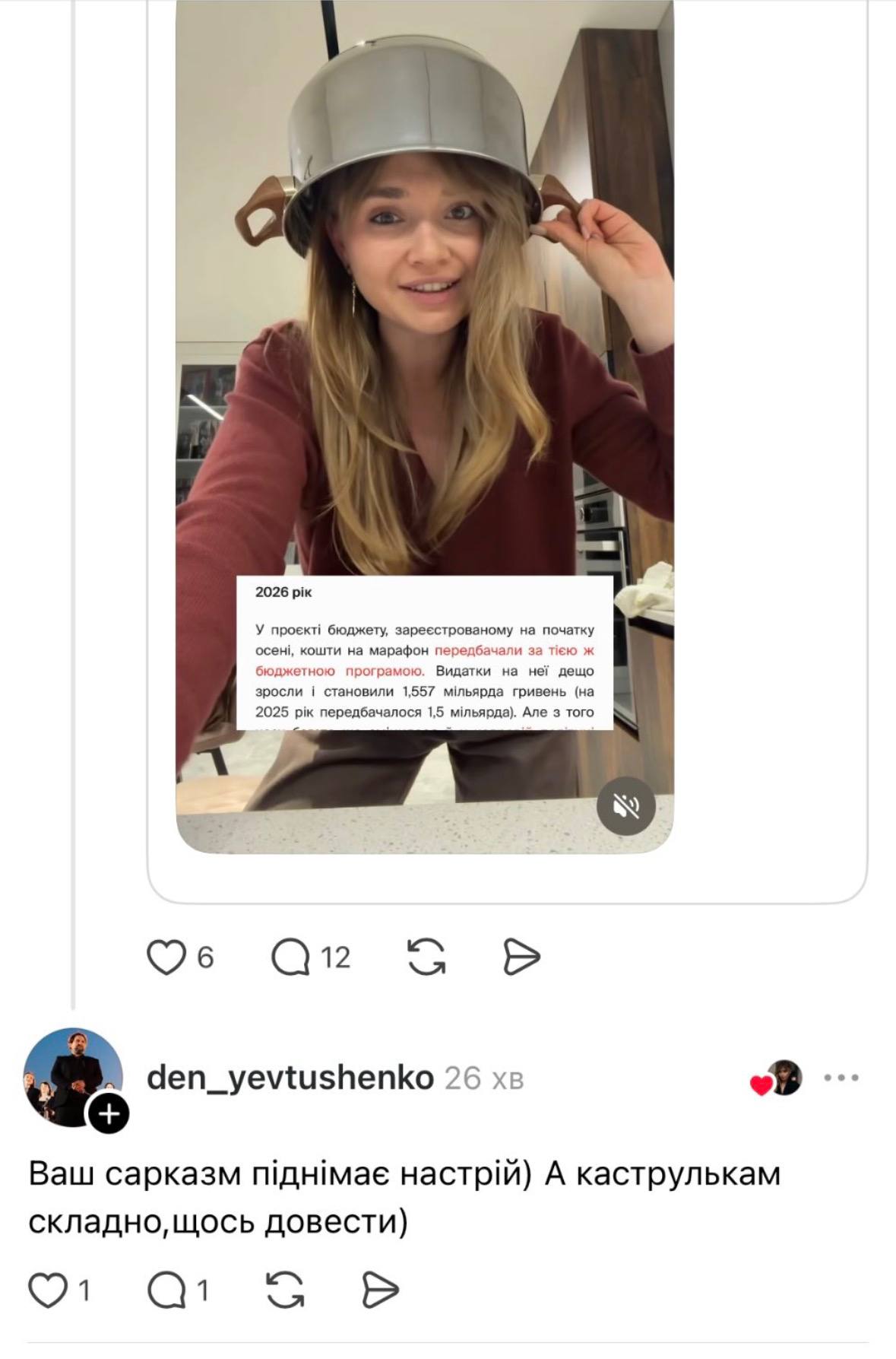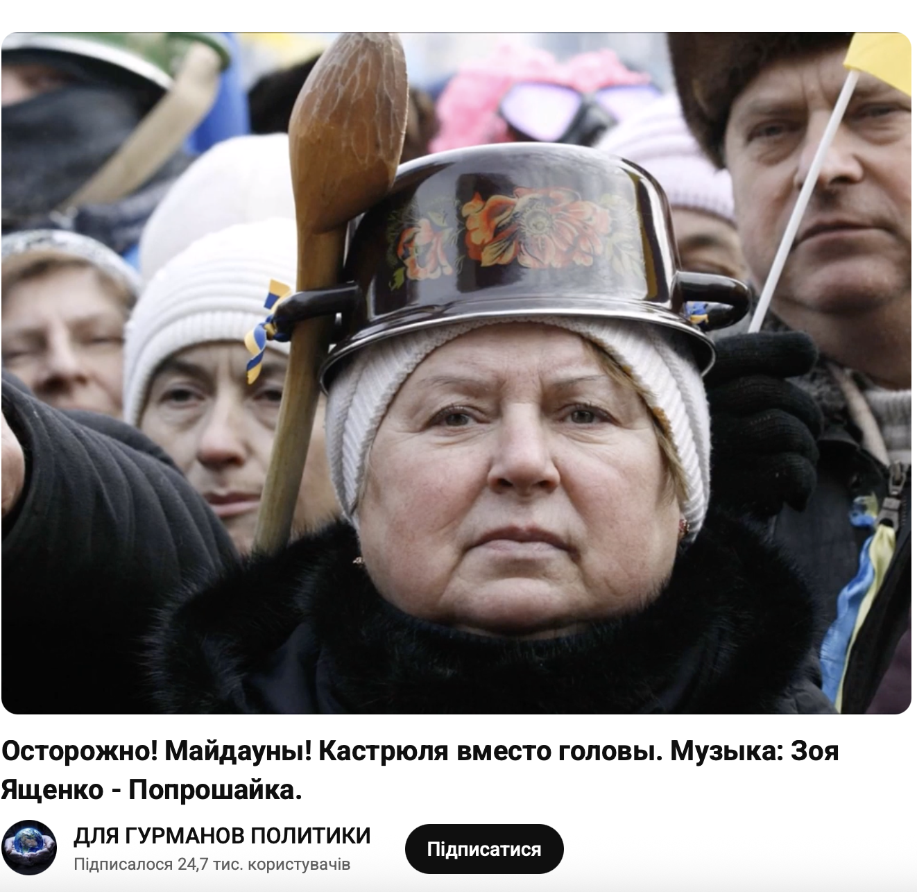 “Каструлю використала аби привернути увагу і з підтекстом того, що це те саме, що й рожеві окуляри, які є символом зашореності і не вбачання пропаганди. Одягнув кастрюлю = ввімкнув телемарафон. Взагалі не знала про її відношення до російської пропаганди до сьогоднішнього ранку. І про майдан 2014, теж не бачила там каструль, лише каски”, – наголосила блогерка.