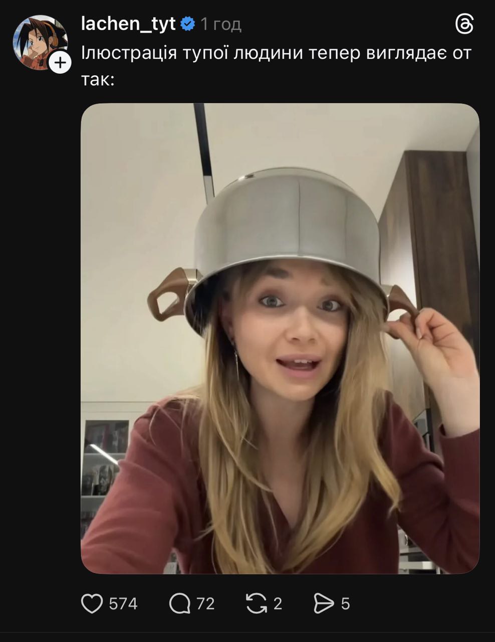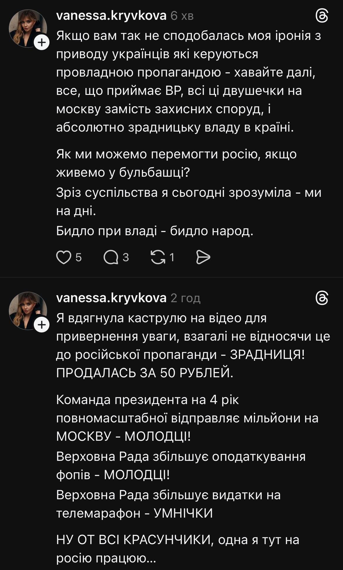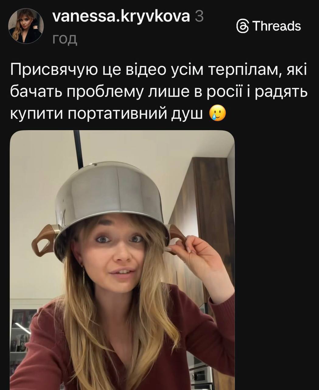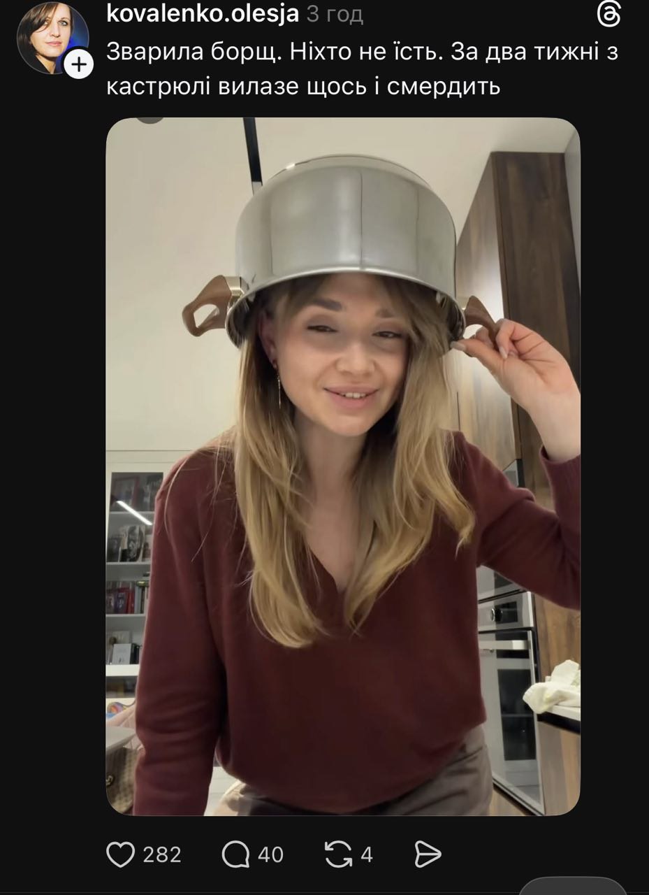 Сьогодні як основний приклад у нас буде останній скандал за участі української блогерки, політологині (!) та дизайнерки Ванесси Крив’якової (vanessakryvkova в Instagram/Threads), чиї свіжі дописи про війну балансують на межі критики та кремлівських тез. Ці дописи – україномовні, співзвучні з об’єктивною критикою багатьох експертів і небайдужих громадян, якби не каструля на голові жінки та підтримка тез про “заслужені” обстріли інфраструктури. І тут я попереджаю: я не вважаю, що вона свідомо працює на російські спецслужби. Тому, задля ліпшого розуміння контексту, надаю пояснення сталого поняття “корисний ідіот”.