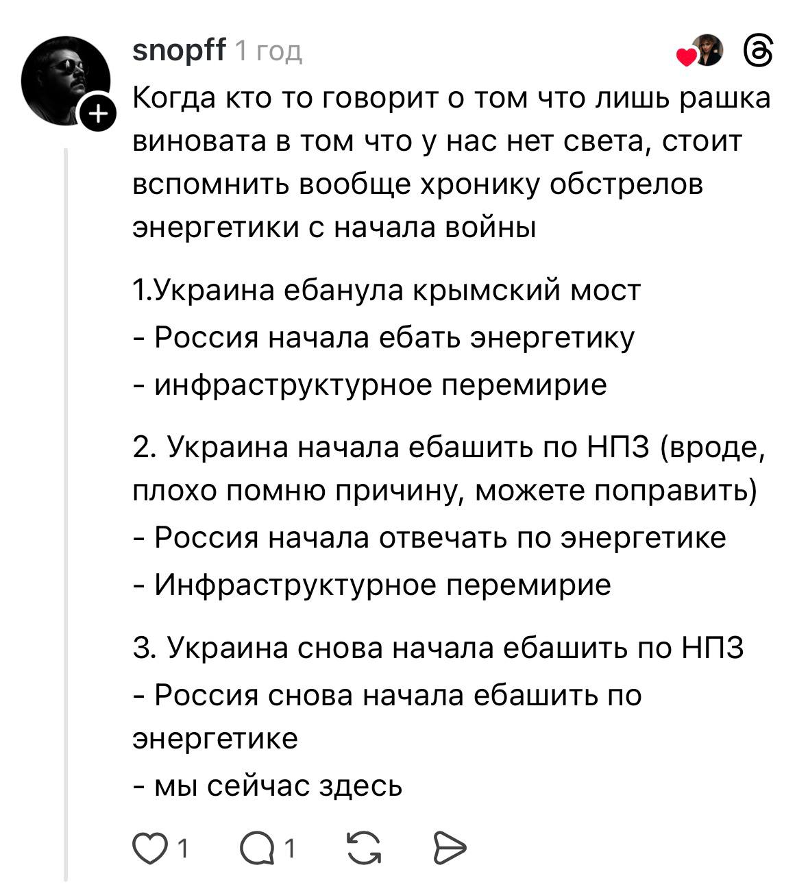 Ворог б’є ракетами по ТЕС і ПС, а блогерка публічно підтверджує: “ну, то не зовсім ворог винен”. Поки люди думають, що причин багато, є шанс, що вони перестануть вірити у власну державу й почнуть шукати “поганого у себе”. Путін уже десять років каже: “Ви самі у всьому винні – і війну почали, і міста обстріляли, і Каховку підірвали, і должны были здатися самі”. Коли українець тиражує цю маячню – він виконує інформаційну роботу ворога, навіть якщо робить це з дурості, а не за гроші.