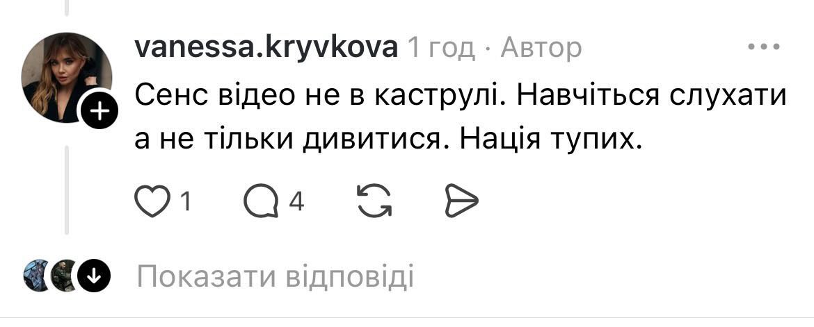 Такі “органічні” інфлюенсери – ключовий інструмент РФ з 2022-го, бо алгоритми соцмереж просувають їх як “альтернативу офіційній пропаганді”. На щастя, реакції українських читачів були вкрай критичними.