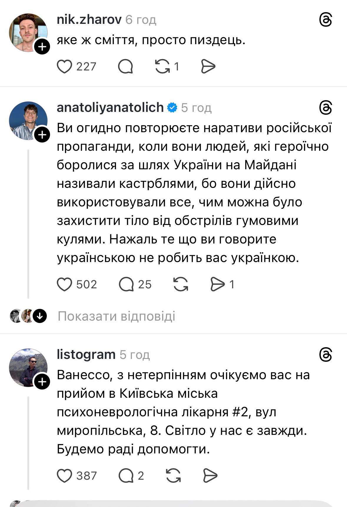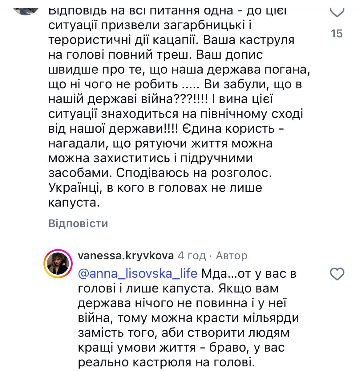 У ролику Ванесса також підняла доволі поширену тезу щодо блекаутів: “Не лише Росія винна в тому, що ми сидимо без світла”. Це класичний both-sidesism – фальшивий баланс, де агресор і жертва нібито “по черзі б’ють”. Насправді, за даними Міненерго, 100% руйнувань енергетики – від російських ударів, а наші контратаки на РФ – легітимна оборона. Але Ванесса лайкає коментарі ботів, які пишуть: “Україна сама провокує, обстрілюючи росіян”.