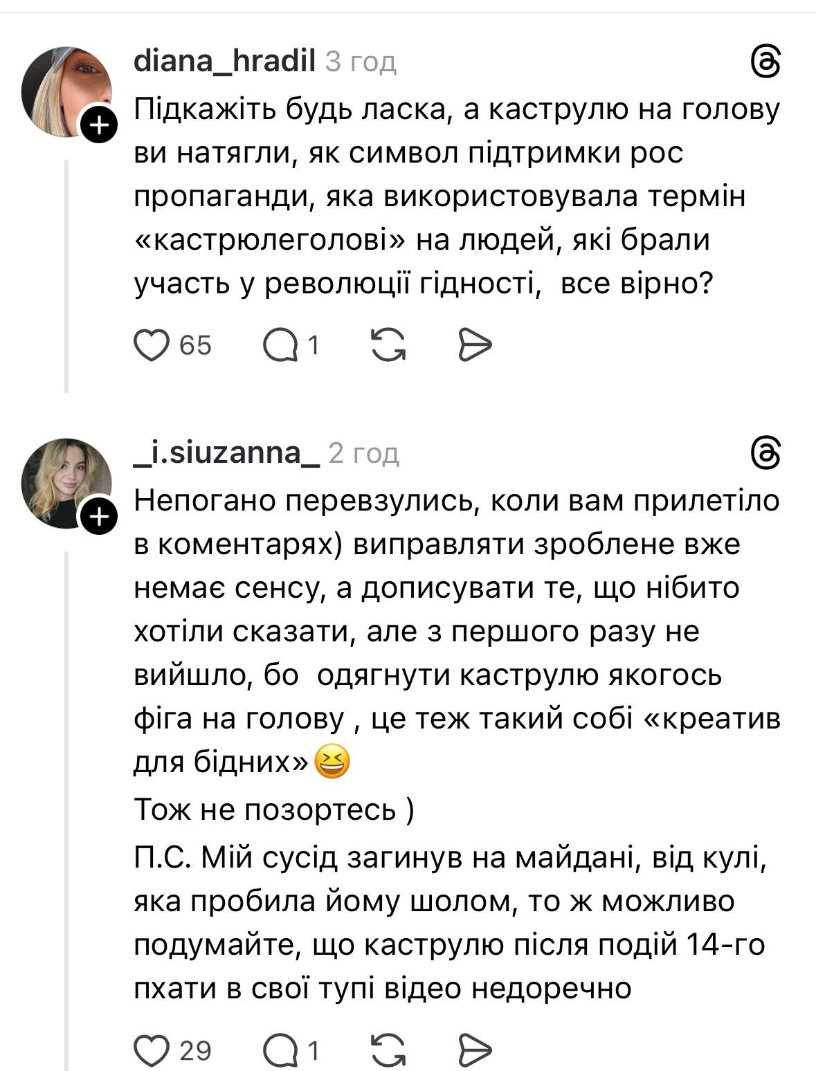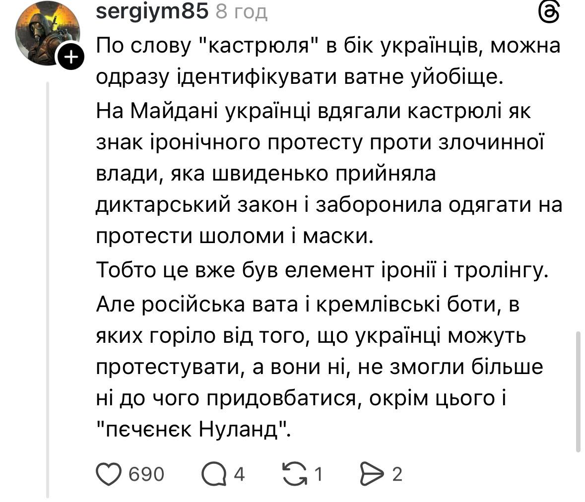 До того в коментарях жінка зазначала, що під час Революції Гідності їй було 11 років – тож цілком ймовірно, що такий нюанс пройшов повз неї, а на курсі політології не розбирали інформаційні кампанії РФ на прикладі Євромайдану. Тоді питання ще серйозніше: російська пропаганда, зокрема й ботоферми, добилися нормалізації своєї тези серед молоді – і це вже суміш токсичної самоіронії з активним підігруванням російській агресії.