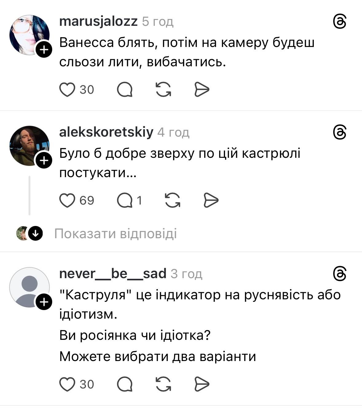 Я звернулася за коментарем до Ванесси. В особистій переписці блогерка зауважила, що не знала про походження зневажливого терміну “кастрюлі/кастрюлеголові” – попри освіту політолога в університеті імені Тараса Шевченка (судячи з біо та дописів в Instagram).